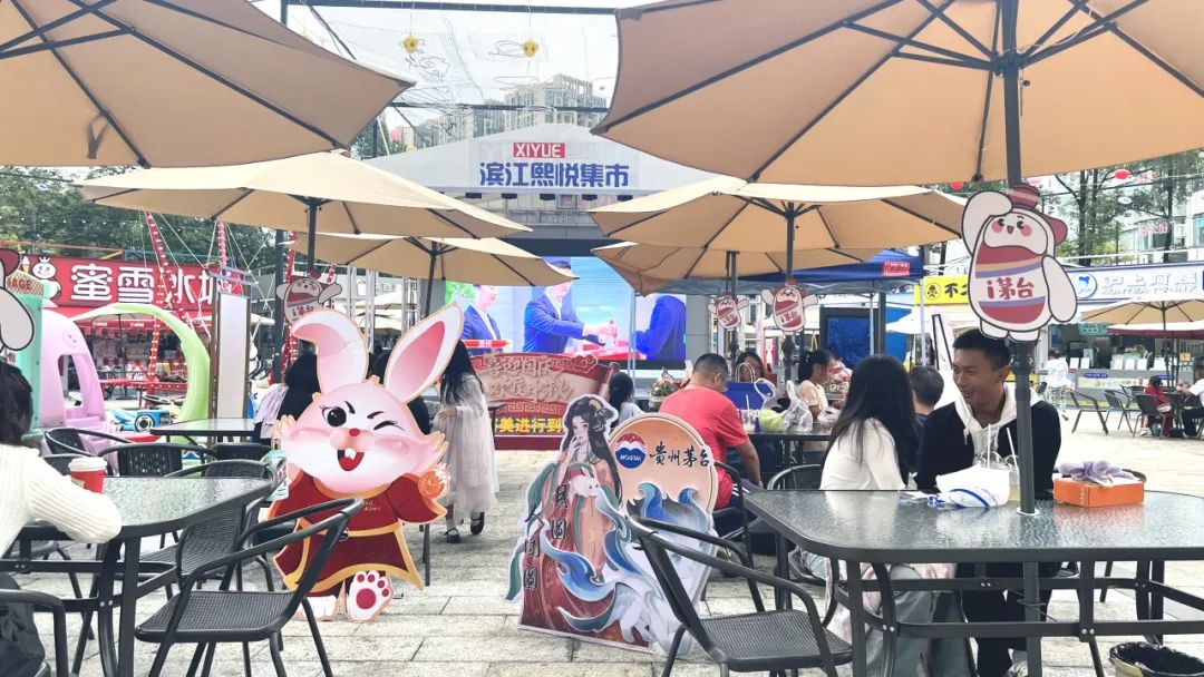 目光所至皆为华夏,五星闪耀皆为信仰。国庆来临,广场上悬挂着五星红旗迎风飘扬,活动现场洋溢着浓浓的节日氛围,茅台系列酒水、茅台冰淇淋与小巽小茅矗立在桌面上,宣传展架与海报相互映衬,大屏上滚动播放着i茅台的宣传广告片,吸引了众多行人驻足观看。