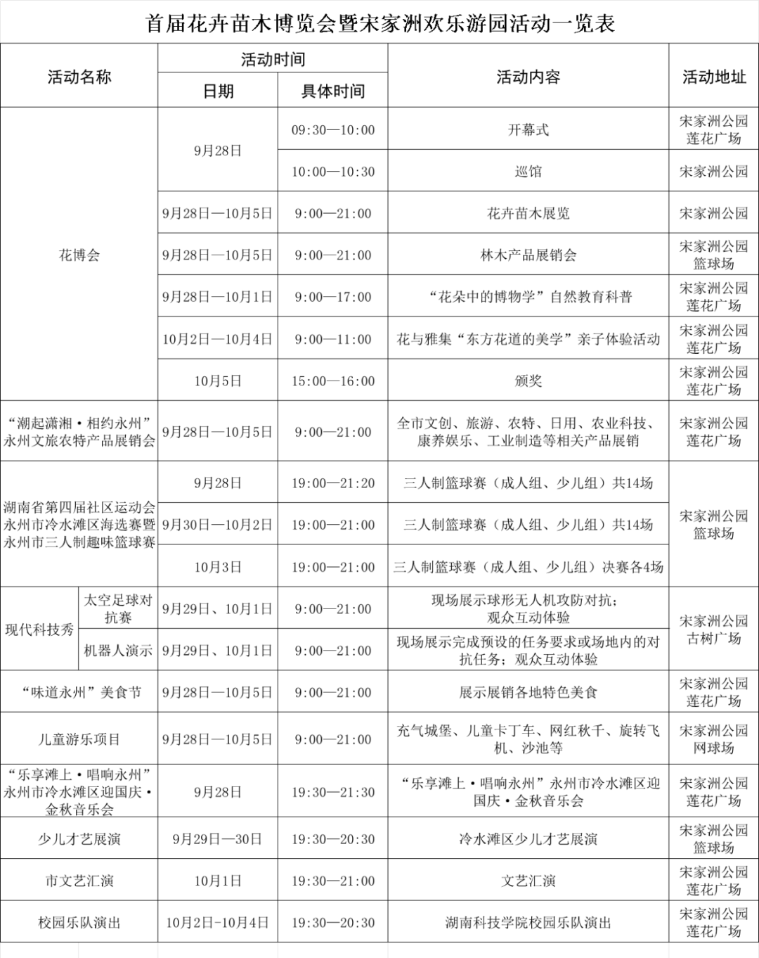 永州市首届花卉苗木博览会暨宋家洲欢乐游园活动将于9月28日正式开幕,10月5日结束。为方便广大市民出行游玩,有效减少道路拥堵,9月28日起,市公交公司同步开通永州市首届花卉苗木博览会暨宋家洲欢乐游园活动公交。