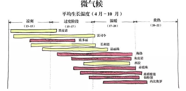 昼夜温差大会增加葡萄酒的酸度,风格更为优雅,有较好的陈年能力,能储存更长的时间。
