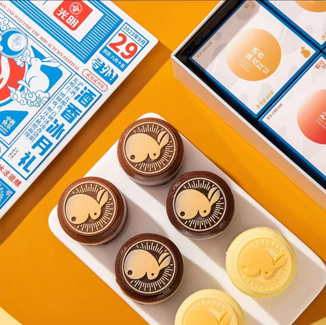 泸州老窖和光明乳业联名,推出的中秋限量“酒香冰淇淋月饼”礼盒中,包括6枚冰淇淋月饼,售价318元。