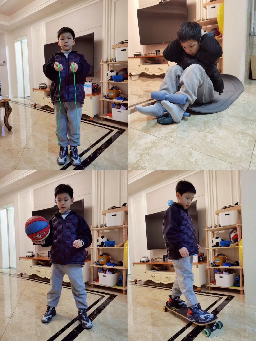 强身健体练起来啦!孩子们骑单车、仰卧起坐、滑板、踢毽子、武术操,跳绳……居家学习和锻炼身体两不误。