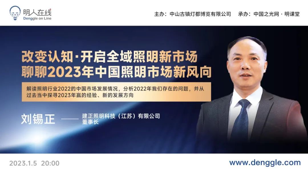 让古镇灯饰点亮世界!第28届古镇灯博会新展期定于2023年3月29日-4月1日,在广东中山灯都古镇举办;破局盛启,双线助力厂商无缝对接。古镇灯博会明人在线也将通过持续分享行业热点,剖析照明产业趋势,带动更多行业人士线上线下热烈的讨论。本期请到的嘉宾是建正照明科技(江苏)有限公司董事长刘锡正先生。承办单位:中国之光网·明课堂