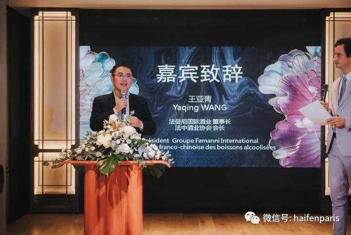 法国法曼尼国际酒业集团董事长王亚青致辞表示法曼尼国际酒业的宗旨就是要把中国酒的历史和文化传播到法国及欧洲其他国家,现在中国白酒已经越来越受到法国消费者的喜爱,法曼尼酒业将会继续努力推广中国白酒,以酒为媒,让更多的法国人品尝到和喜爱上我们的中国白酒。为中法文化贸易交流尽一份力。
