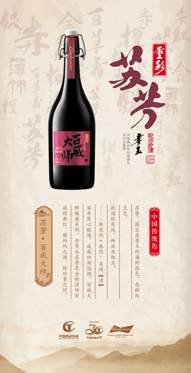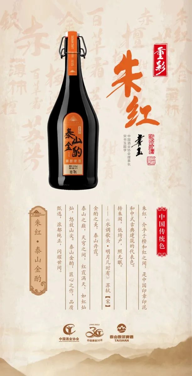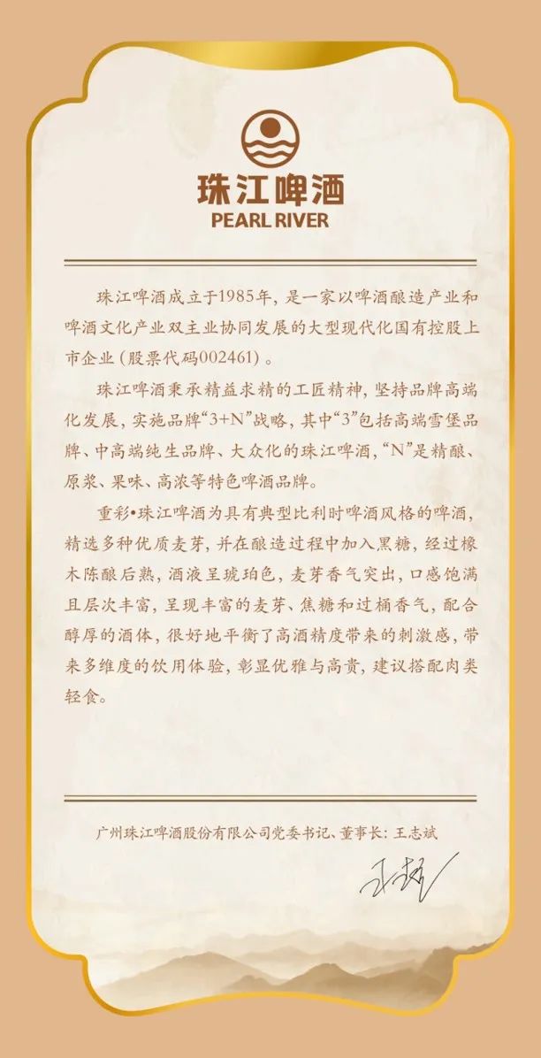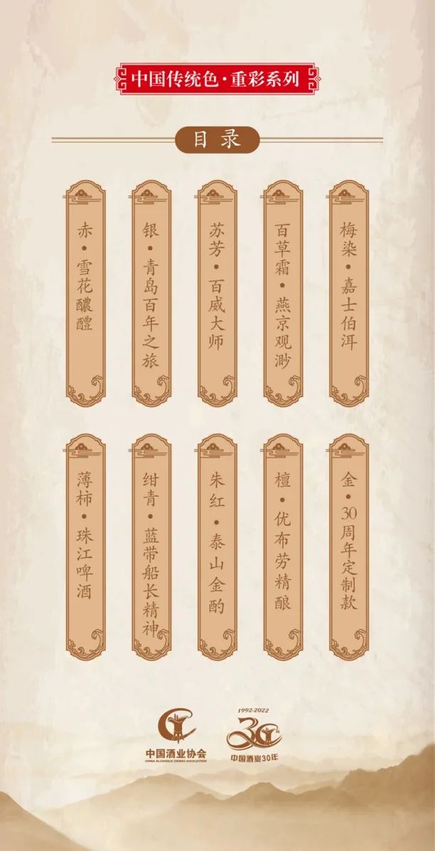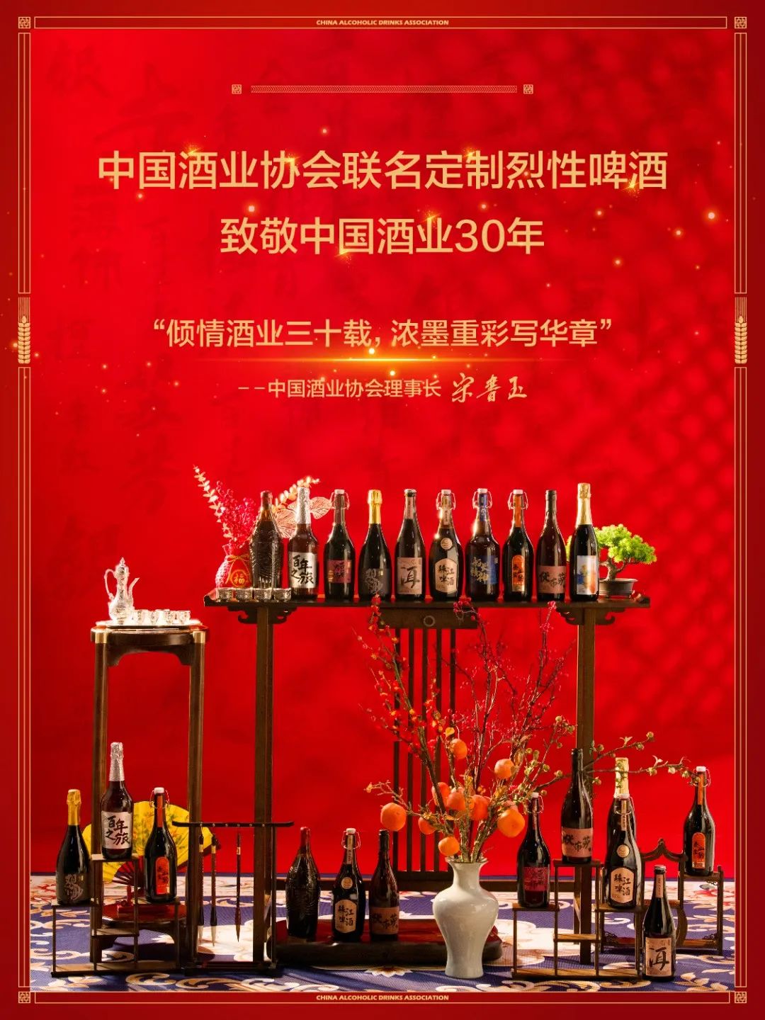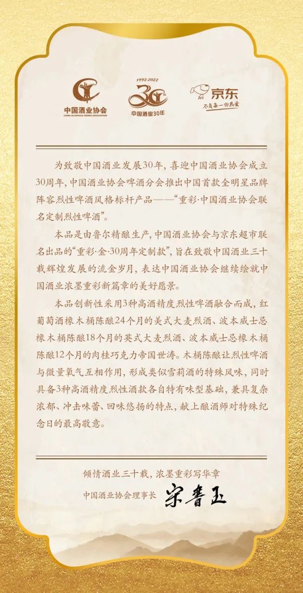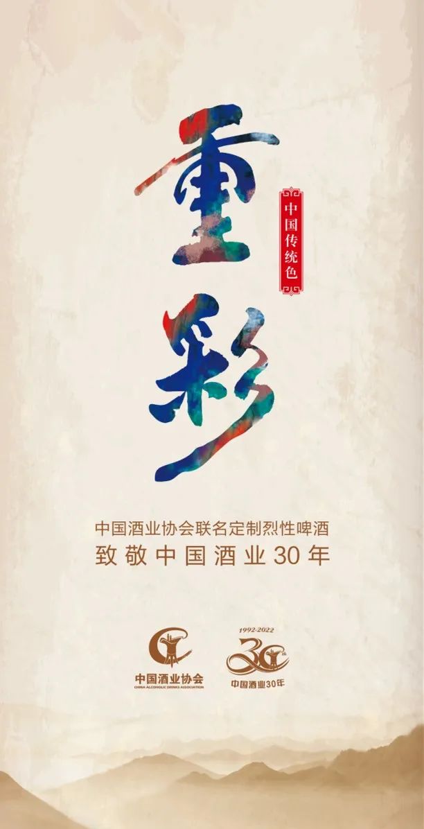 为致敬中国酒业辉煌发展30年,值此中国酒业协会成立30周年之际,由啤酒分会发起并主导,联合华润雪花啤酒(中国)有限公司、青岛啤酒股份有限公司、百威投资(中国)有限公司、北京燕京啤酒股份有限公司、嘉士伯中国、广州珠江啤酒股份有限公司、肇庆蓝带啤酒有限公司、山东泰山啤酒有限公司、优布劳(中国)精酿啤酒有限公司、京东、鲁尔精酿(迁安)酒业有限公司,以产品创新和国潮文化相结合,精准定位尚未规模化发展的国内烈性啤酒市场,推出中国首款全明星品牌阵容烈性啤酒风格标杆产品—“重彩·中国酒业协会联名定制烈性啤酒”。