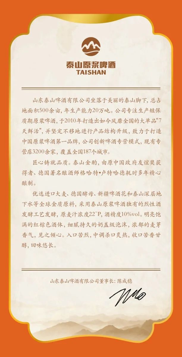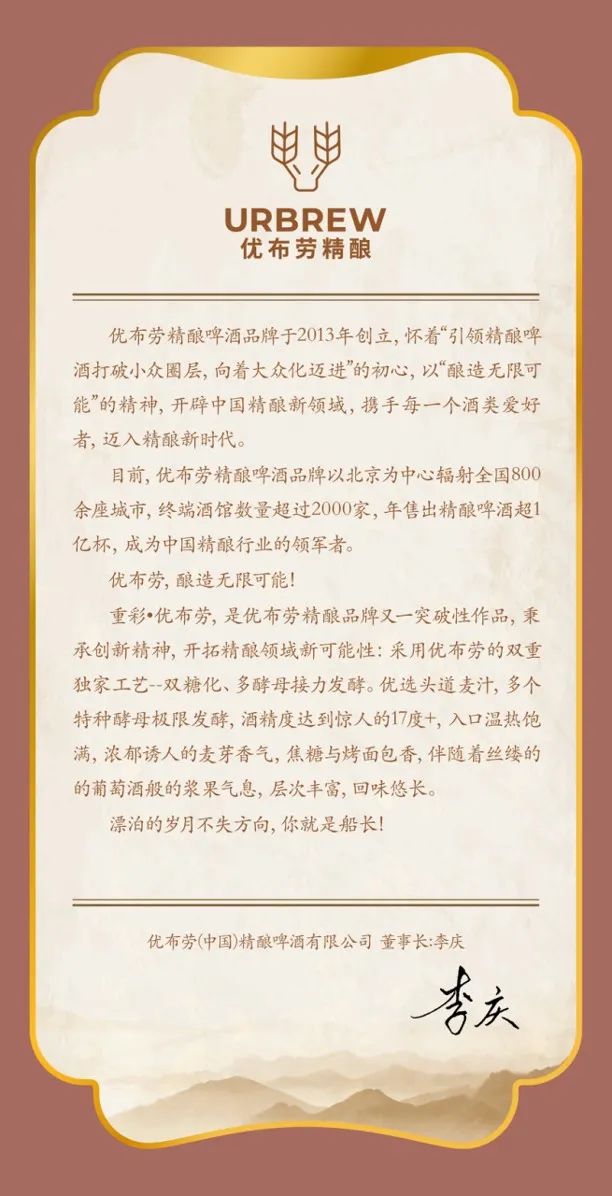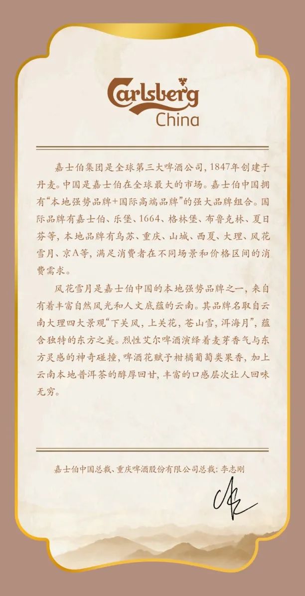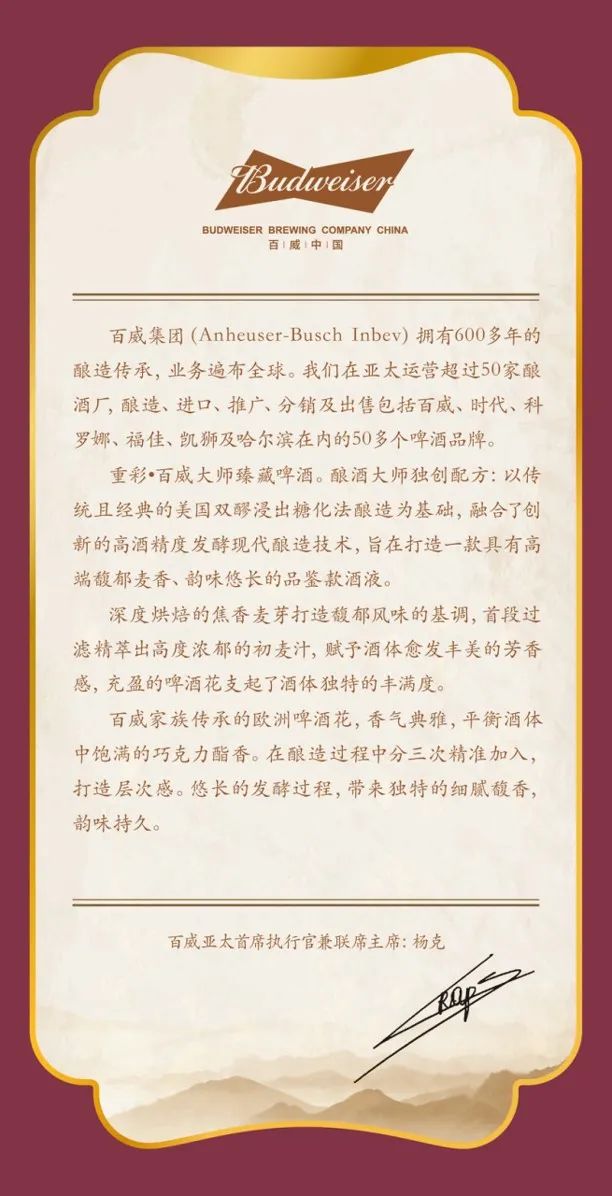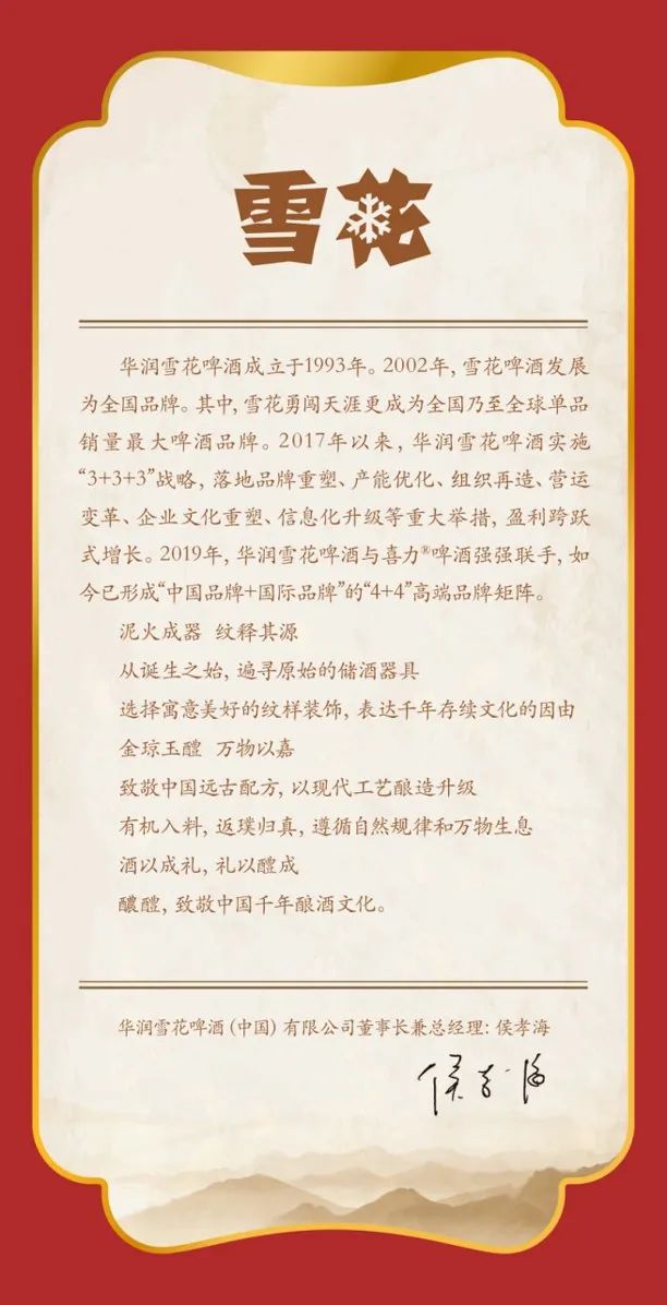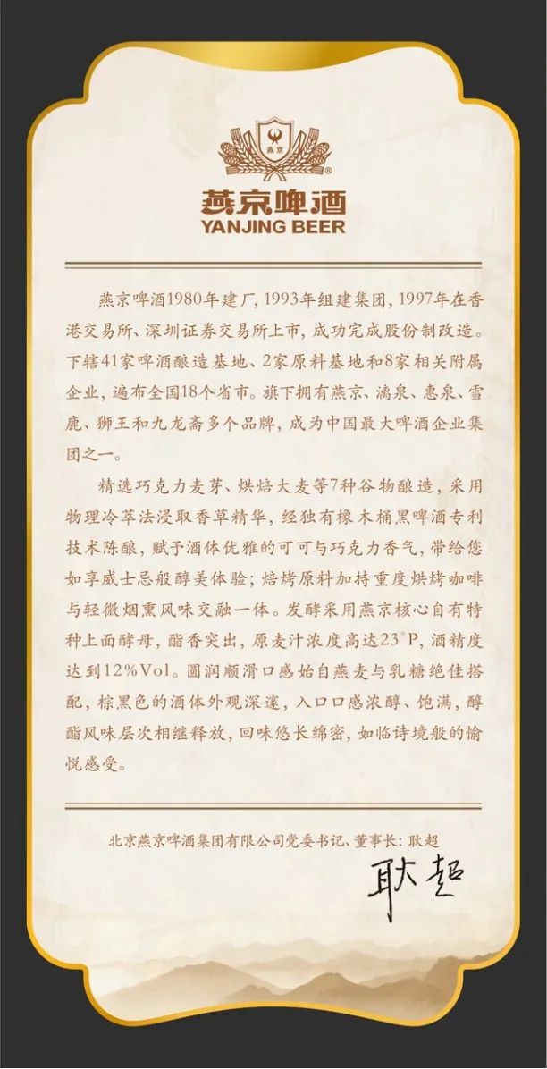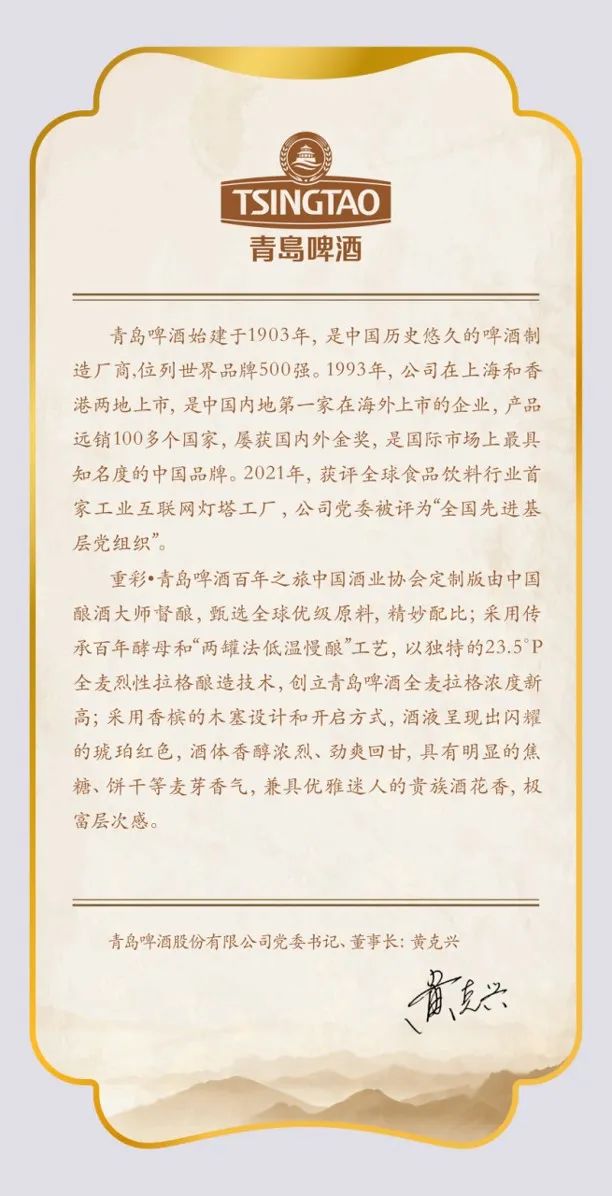 为致敬中国酒业辉煌发展30年,值此中国酒业协会成立30周年之际,由啤酒分会发起并主导,联合华润雪花啤酒(中国)有限公司、青岛啤酒股份有限公司、百威投资(中国)有限公司、北京燕京啤酒股份有限公司、嘉士伯中国、广州珠江啤酒股份有限公司、肇庆蓝带啤酒有限公司、山东泰山啤酒有限公司、优布劳(中国)精酿啤酒有限公司、京东、鲁尔精酿(迁安)酒业有限公司,以产品创新和国潮文化相结合,精准定位尚未规模化发展的国内烈性啤酒市场,推出中国首款全明星品牌阵容烈性啤酒风格标杆产品—“重彩·中国酒业协会联名定制烈性啤酒”。