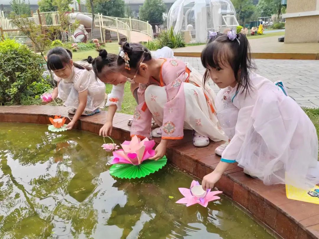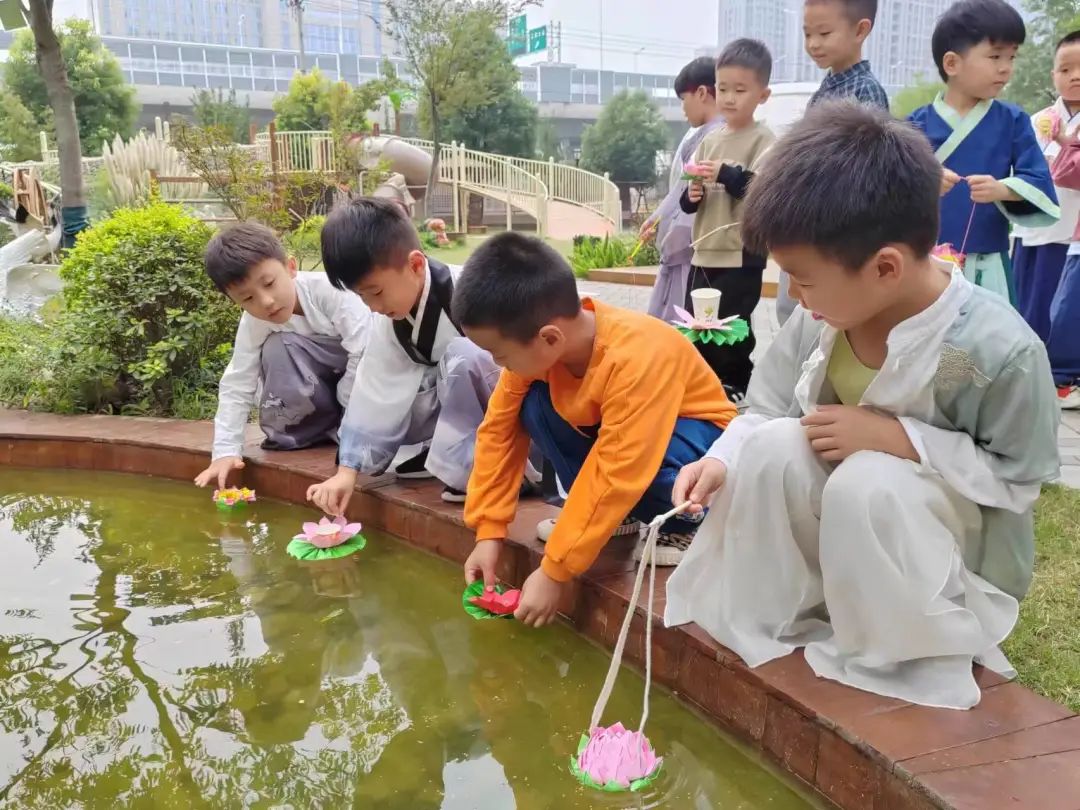 放一盏灯,许一个愿,孩子们与爸爸妈妈一起制作的荷灯,把希望寄托于一盏盏荷灯,照亮对未来美好的祝愿。