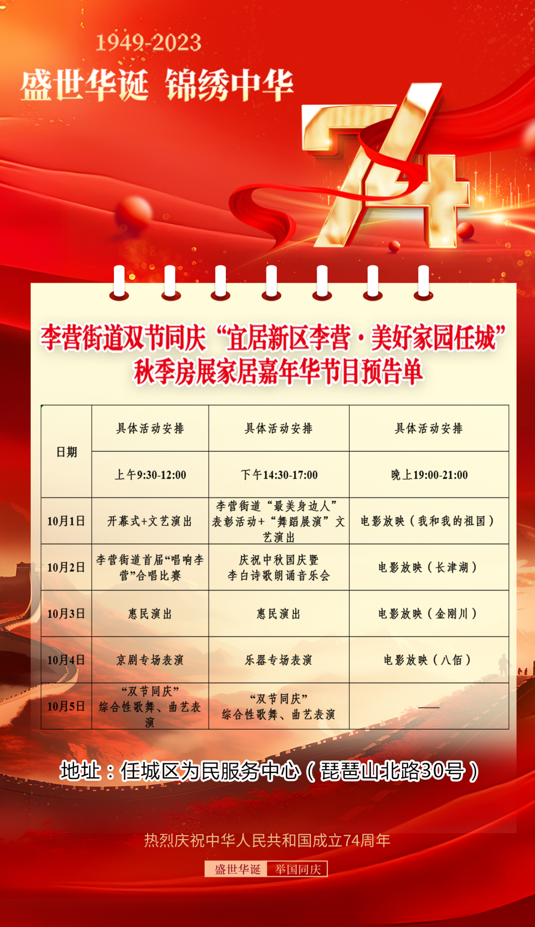 10月1日-10月5日,每天都有精彩的文艺演出、电影放映等您来观看!
