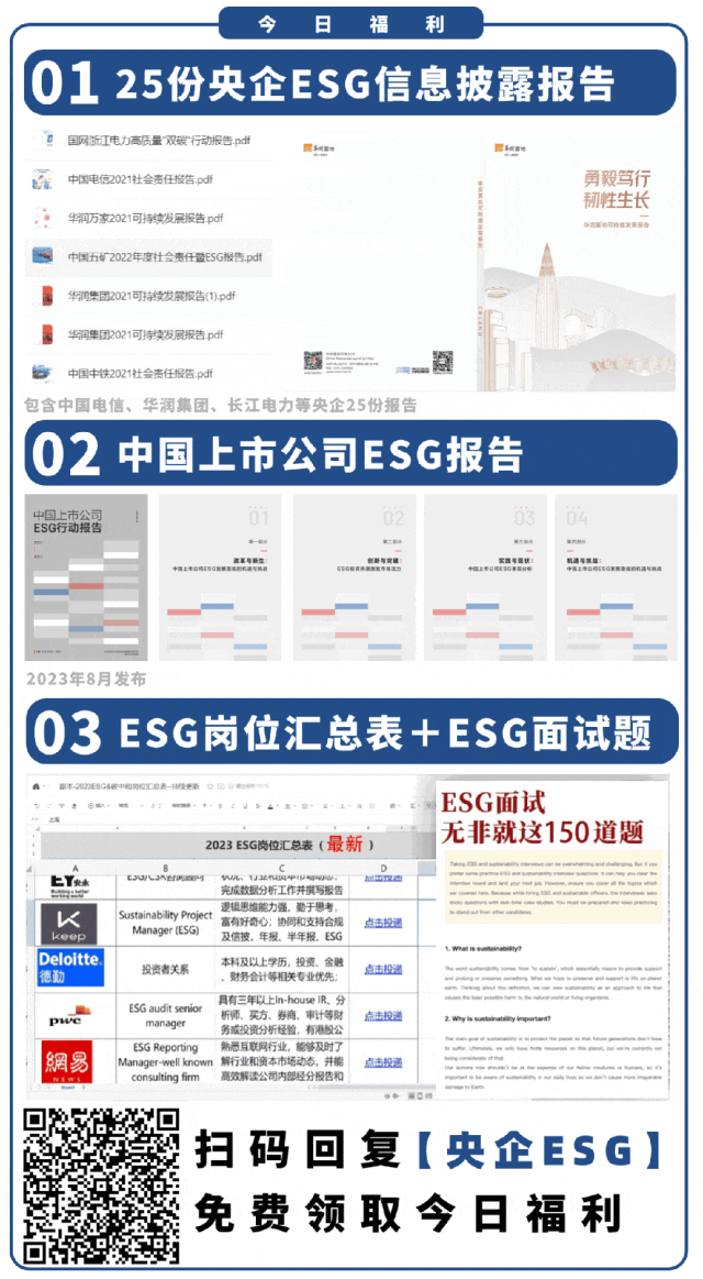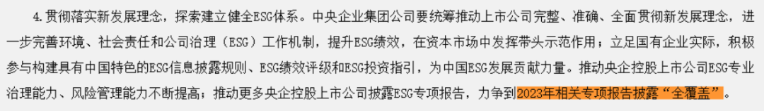 2016年,国务院国资委发布了《关于国有企业更好履行社会责任的指导意见》,提出了将社会责任融入企业运营,建立社会责任指标体系的目标。5月,国务院国资委颁布了《提高央企控股上市公司质量工作方案》,明确要探索并健全ESG体系,鼓励更多央企控股上市公司披露ESG专项报告,并力争在2023年实现相关专项报告的“全覆盖”。