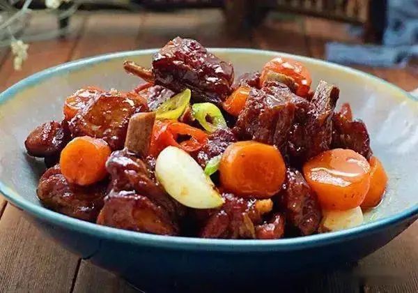7.将胡萝卜放到快煮好的羊排里,翻炒几下,加盐调味,再焖煮二十分钟。