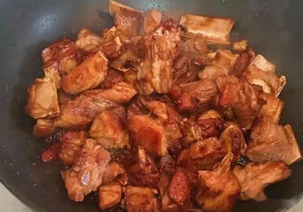 4.开中火,放入羊排翻炒,让羊排均匀的裹上糖色,煎至两面微黄。