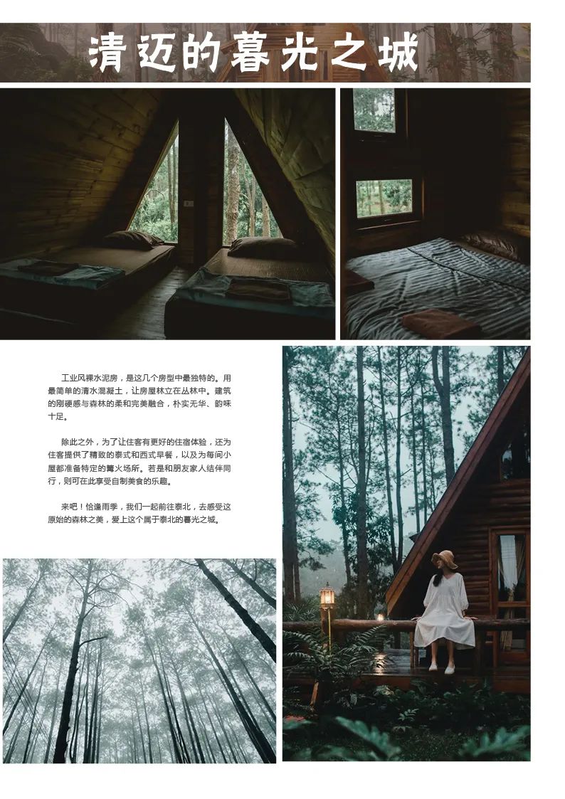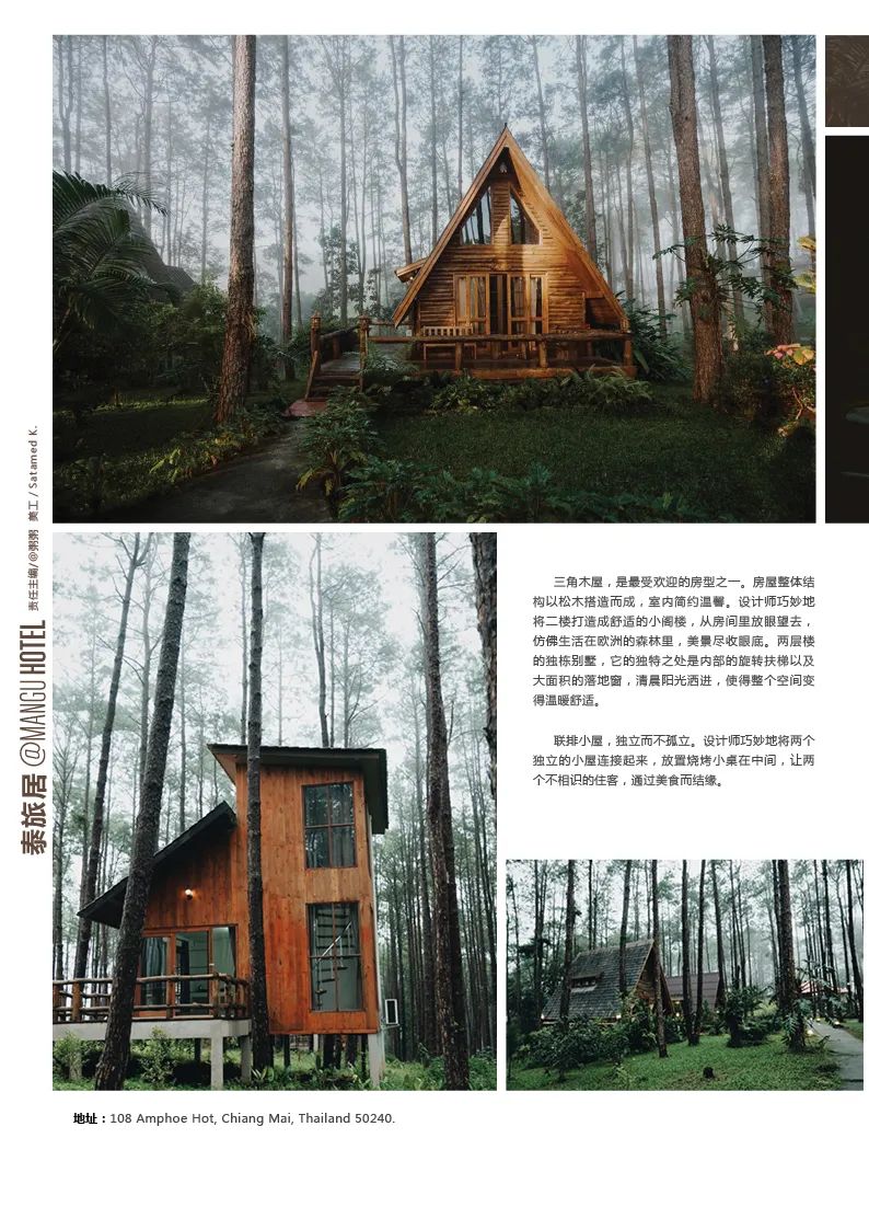 三角木屋,是最受欢迎的房型之一。房屋整体结构以松木搭造而成,室内简约温馨。设计师巧妙地将二楼打造成舒适的小阁楼,从房间里放眼望去,仿佛生活在欧洲的森林里,美景尽收眼底。两层楼的独栋别墅,它的独特之处是内部的旋转扶梯以及大面积的落地窗,清晨阳光洒进,使得整个空间变得温暖舒适。