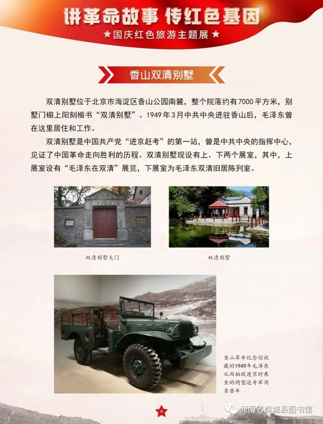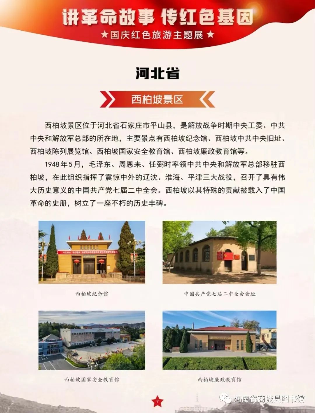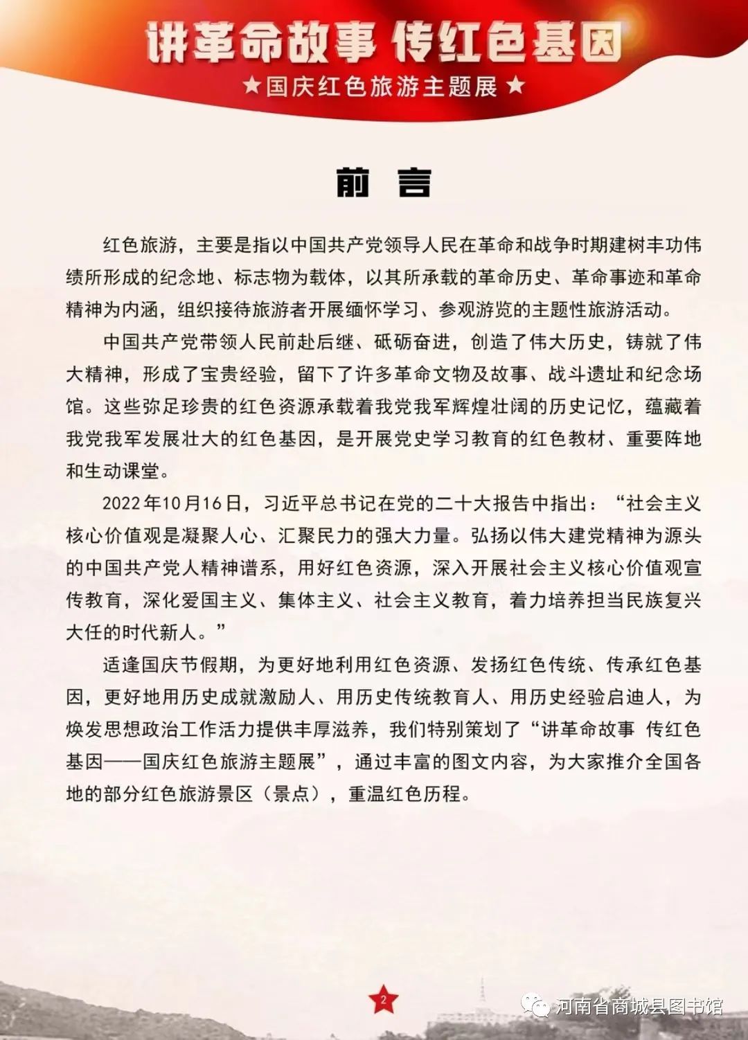 红色旅游,主要是指以中国共产党领导人民在革命和战争时期建树丰功伟绩所形成的纪念地、标志物为载体,以其所承载的革命历史、革命事迹和革命精神为内涵,组织接待旅游者开展缅怀学习、参观游览的主题性旅游活动。中国共产党带领人民前赴后继、砥砺奋进,创造了伟大历史,铸就了伟大精神,形成了宝贵经验,留下了许多革命文物及故事、战斗遗址和纪念场馆。这些弥足珍贵的红色资源承载着我党我军辉煌壮阔的历史记忆,蕴藏着我党我军发展壮大的红色基因,是开展党史学习教育的红色教材、重要阵地和生动课堂。2022年10月16日,习近平总书记在党的二十大报告中指出:"社会主义核心价值观是凝聚人心、汇聚民力的强大力量。弘扬以伟大建党精神为源头的中国共产党人精神谱系,用好红色资源,深入开展社会主义核心价值观宣传教育,深化爱国主义、集体主义、社会主义教育,着力培养担当民族复兴大任的时代新人。"适逢国庆节假期,为更好地利用红色资源、发扬红色传统、传承红色基因,更好地用历史成就激励人、用历史传统教育人、用历史经验启迪人,为焕发思想政治工作活力提供丰厚滋养,我们特别策划了"讲革命故事传红色基因——国庆红色旅游主题展",通过丰富的图文内容,为大家推介全国各地的部分红色旅游景区(景点),重温红色历程.