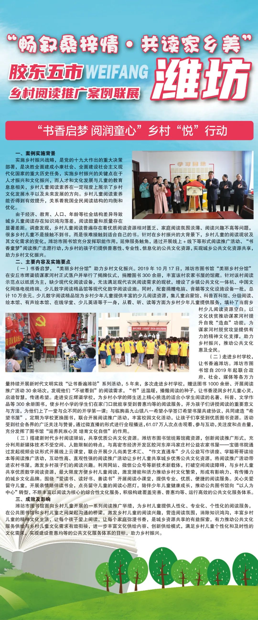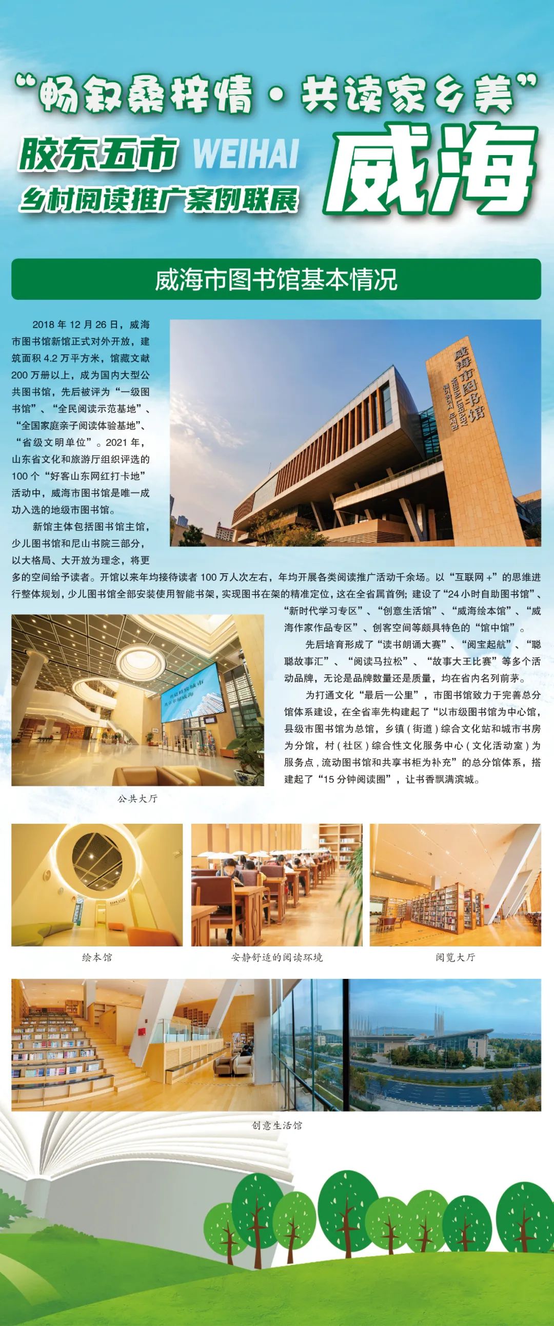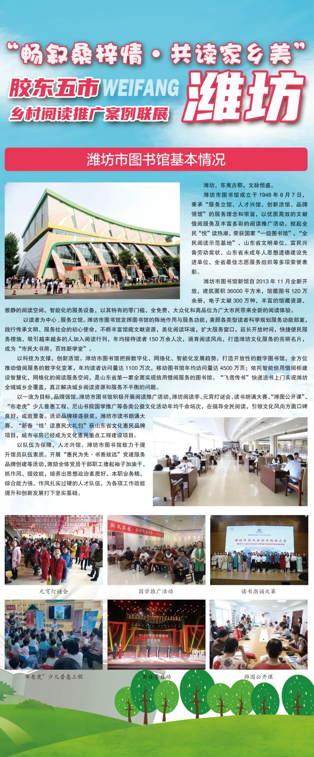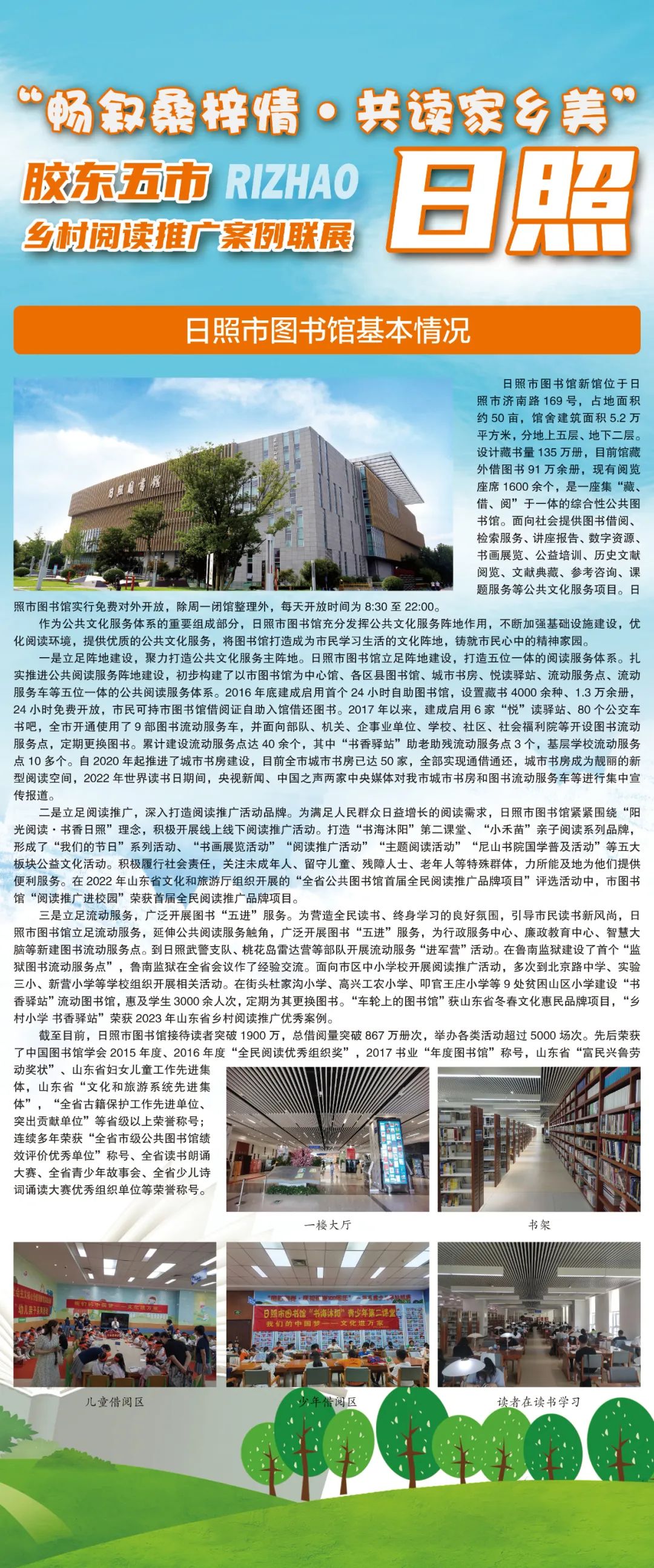 2023年6月,胶东五市公共图书馆联盟在日照召开研讨会,共同商讨如何发挥公共图书馆资源优势,助力乡村振兴建设。会议确定举办以“畅叙桑梓情·共读家乡美”为主题的胶东五市乡村阅读推广优秀案例联展,展示胶东五市公共图书馆在乡村阅读推广工作中的优秀成果,让读者加深对乡村阅读推广项目的了解 。