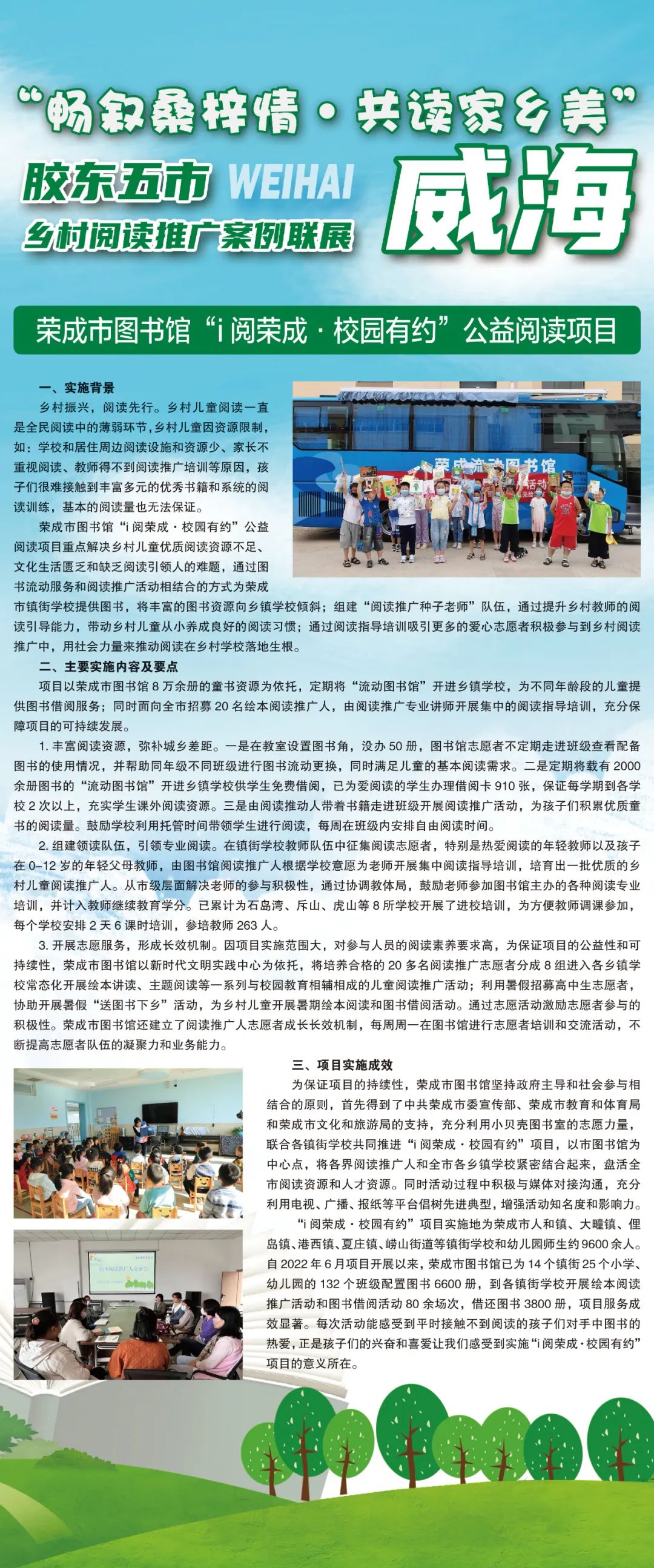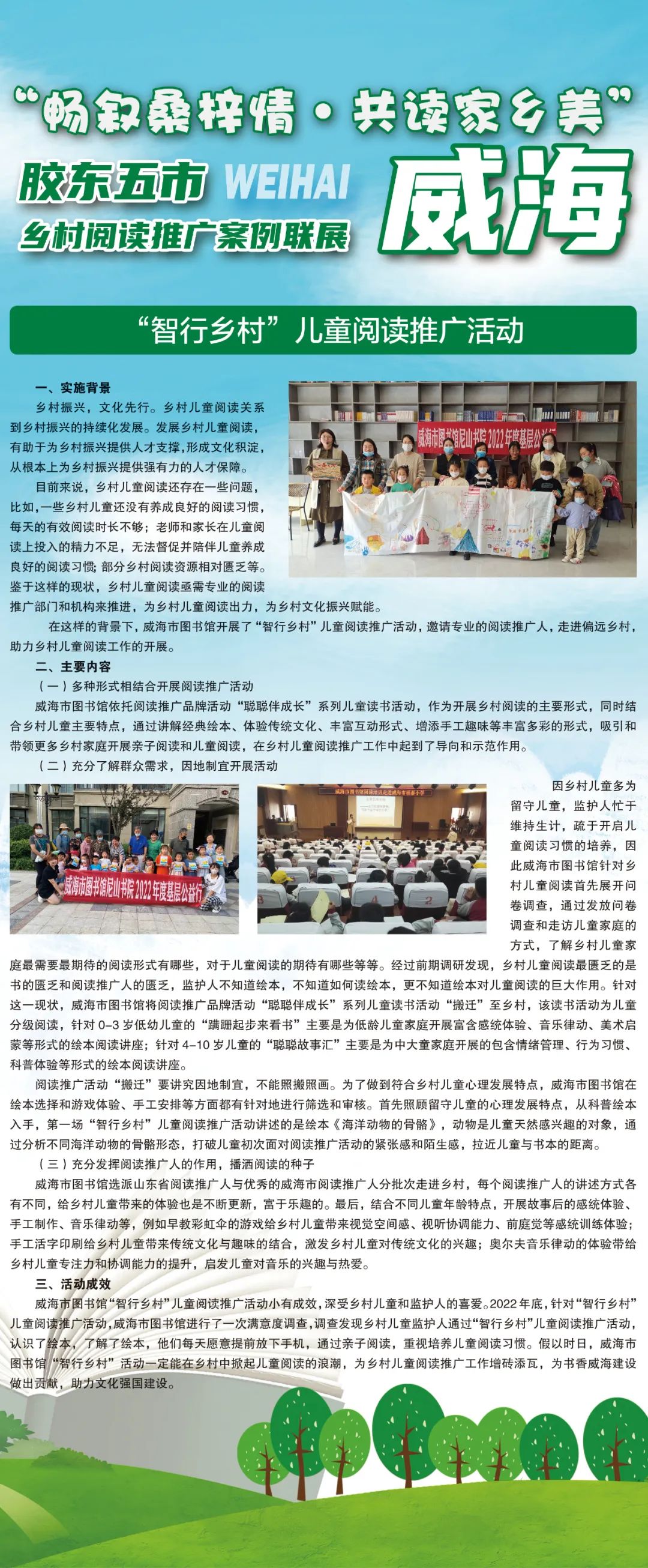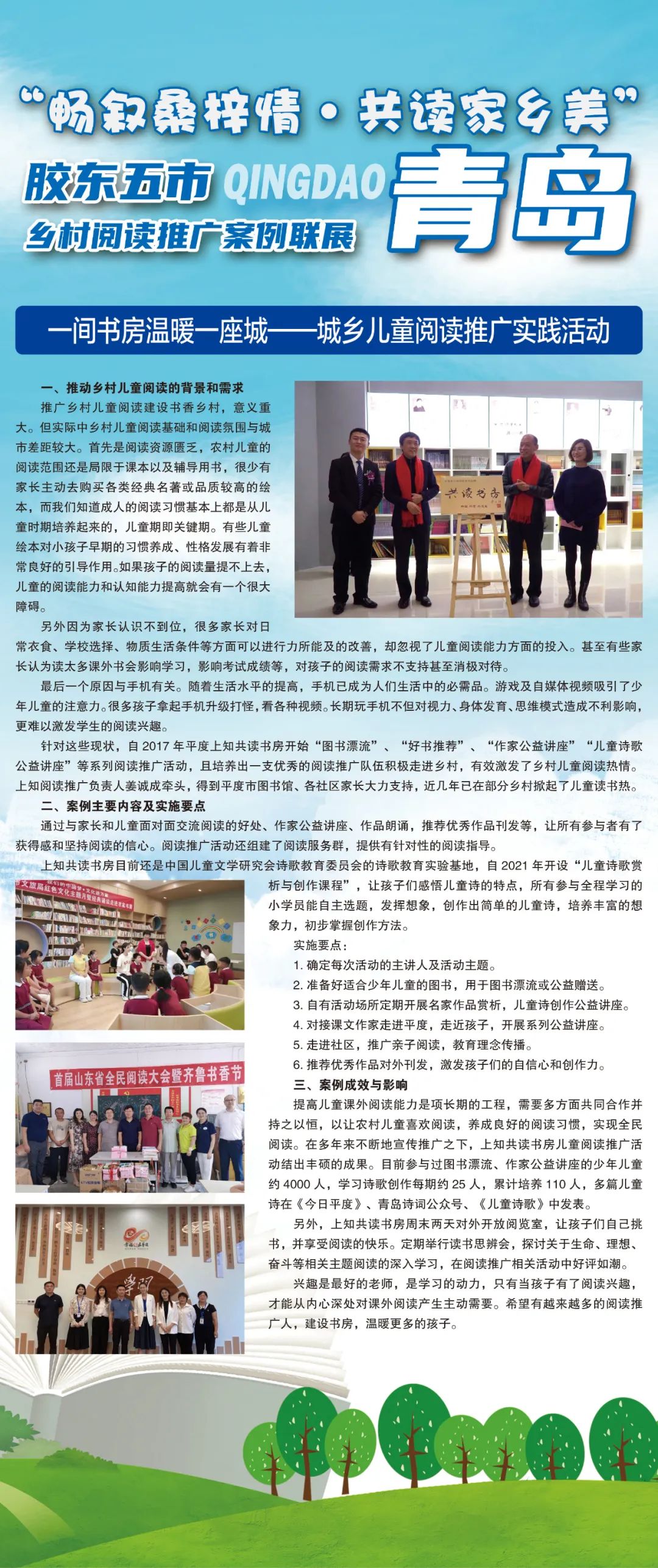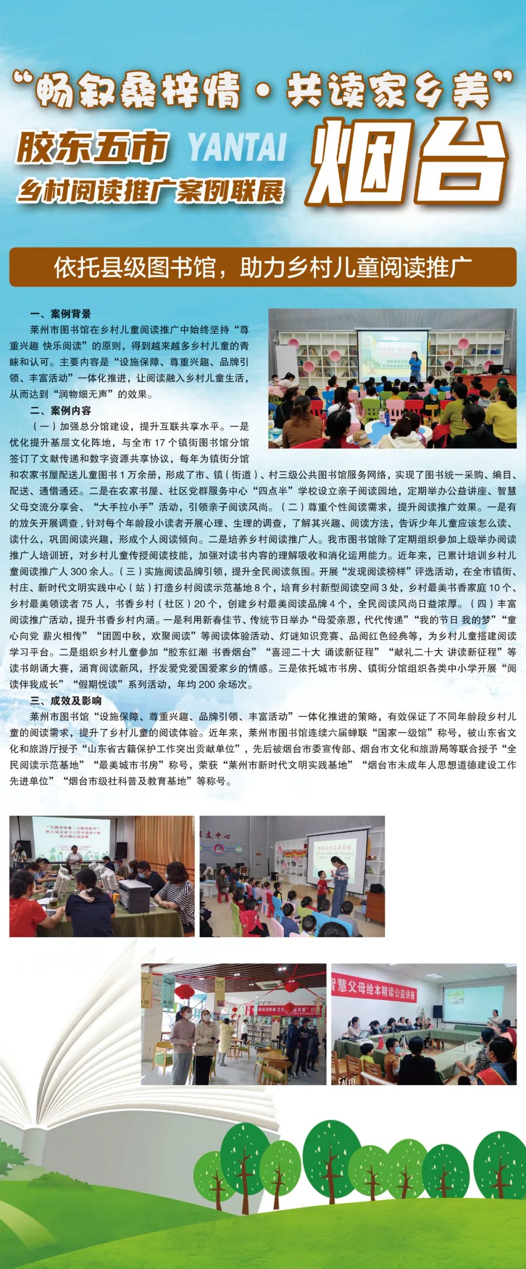 2023年6月,胶东五市公共图书馆联盟在日照召开研讨会,共同商讨如何发挥公共图书馆资源优势,助力乡村振兴建设。会议确定举办以“畅叙桑梓情·共读家乡美”为主题的胶东五市乡村阅读推广优秀案例联展,展示胶东五市公共图书馆在乡村阅读推广工作中的优秀成果,让读者加深对乡村阅读推广项目的了解 。