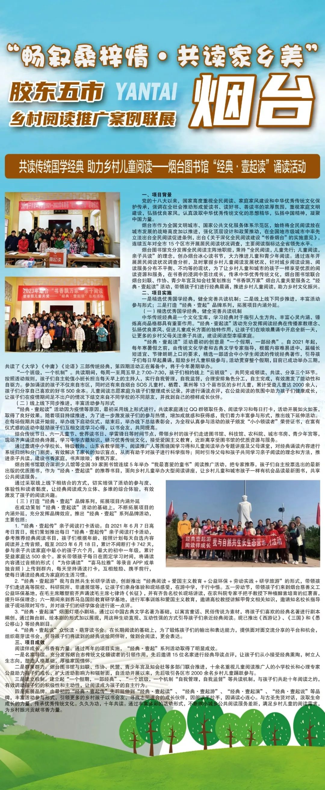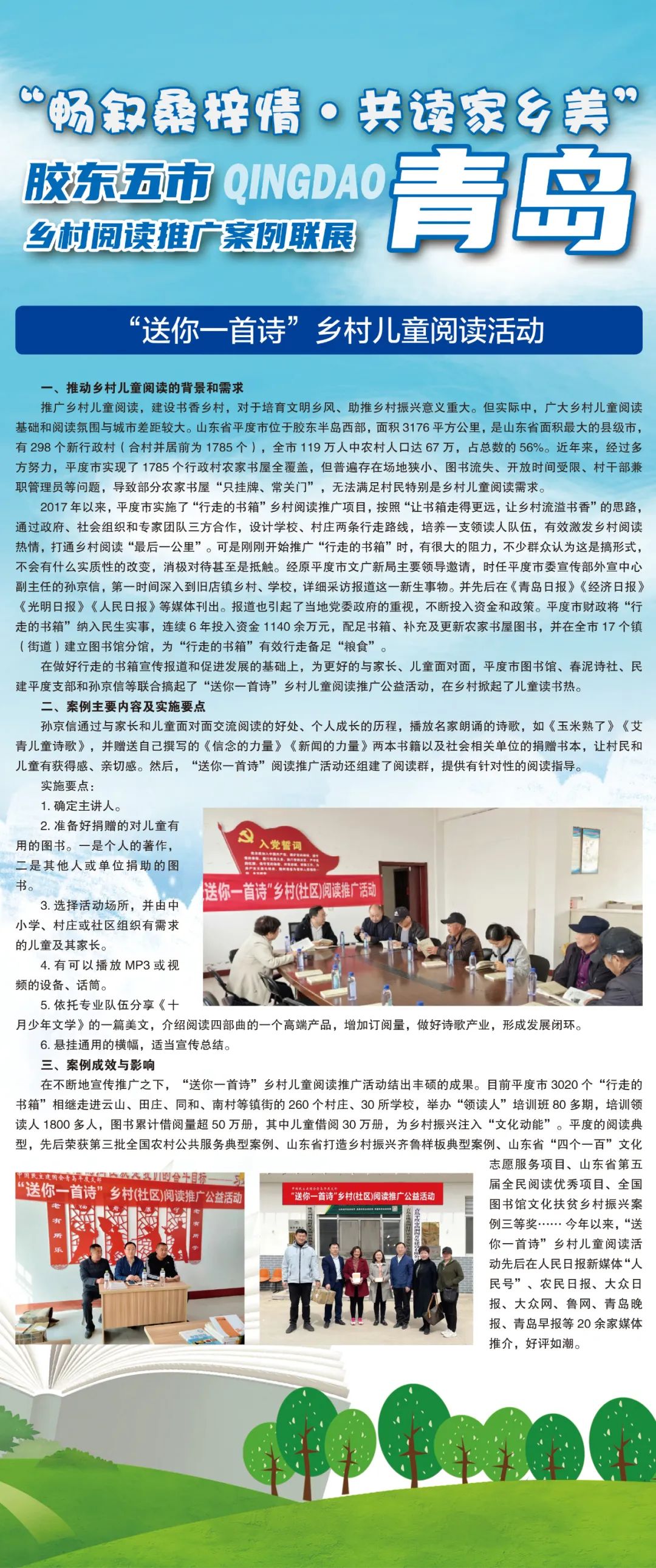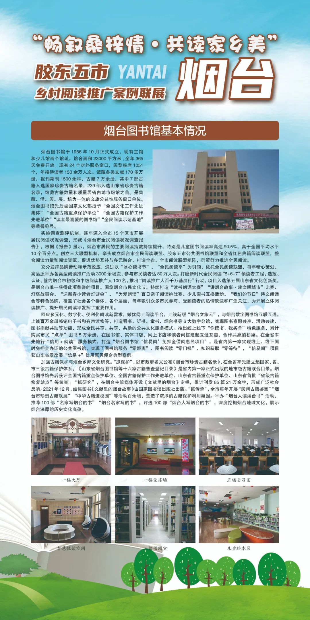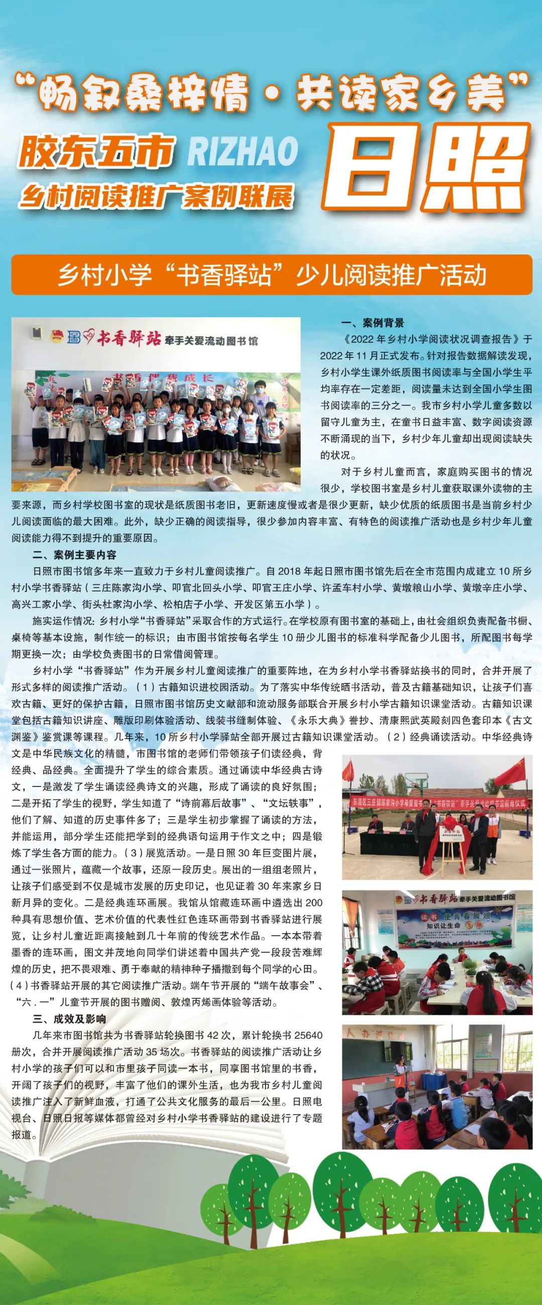 2023年6月,胶东五市公共图书馆联盟在日照召开研讨会,共同商讨如何发挥公共图书馆资源优势,助力乡村振兴建设。会议确定举办以“畅叙桑梓情·共读家乡美”为主题的胶东五市乡村阅读推广优秀案例联展,展示胶东五市公共图书馆在乡村阅读推广工作中的优秀成果,让读者加深对乡村阅读推广项目的了解 。