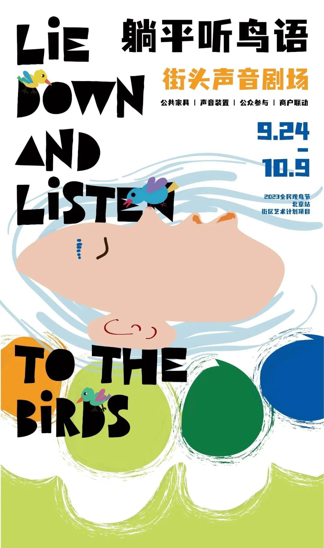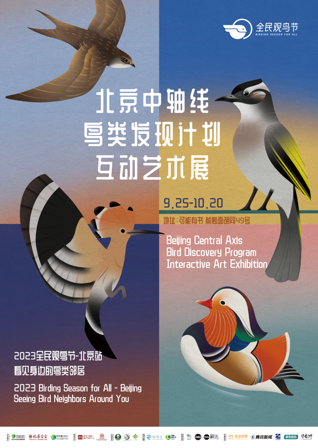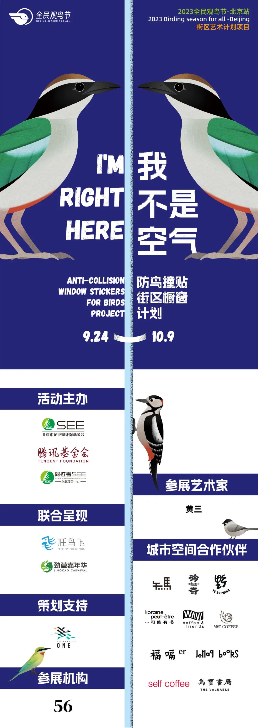 “全民观鸟节”是由SEE基金会与腾讯基金会联合发起的鸟类公民科学活动,该活动希望带动更多人认识中国鸟类生物多样性之美;成为鸟类公民科学家;提升全社会鸟类保护、保护自然的意识,助力中国鸟类保护事业发展。2023年的主题为“看见身边的鸟类邻居”。“2023全民观鸟节”的北京站由阿拉善SEE华北项目中心支持,主题为“北京中轴线鸟类发现计划”。其中街区艺术计划之一《我不是空气》防鸟撞贴街区橱窗计划将落地朝阳门分会场。我们将利用十个街区商户的橱窗展示防鸟撞贴纸,以此倡议大家保护鸟类。