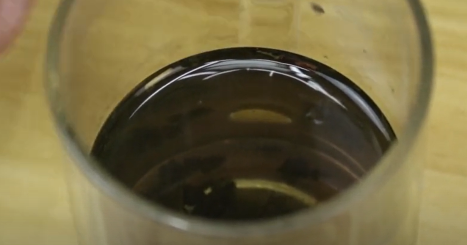 如果说是纯粮白酒,这个时候会出现淡黄色,但是如果是假的白酒就会出现紫黑色,这个效果非常的明显,家里边有白酒的,我们也可以试一下。