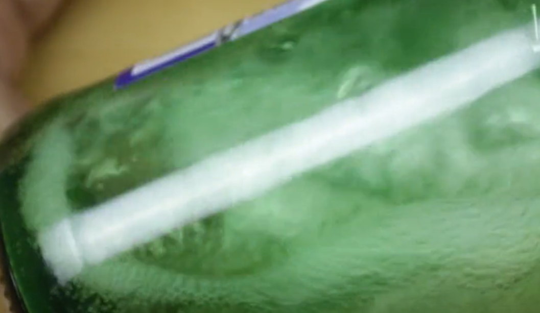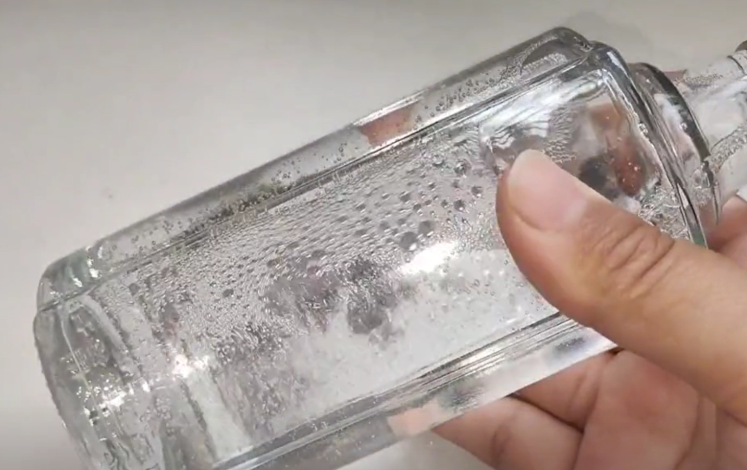 第一个方法,看白酒的酒花。现在大部分的白酒瓶子都是玻璃透明状态的,我们可以拿在手里边这样使劲摇晃几下,看一下白酒的酒花,这里边的泡沫状就是白酒的酒花。