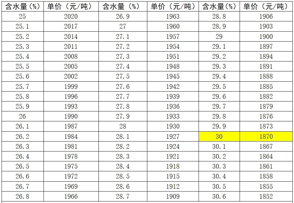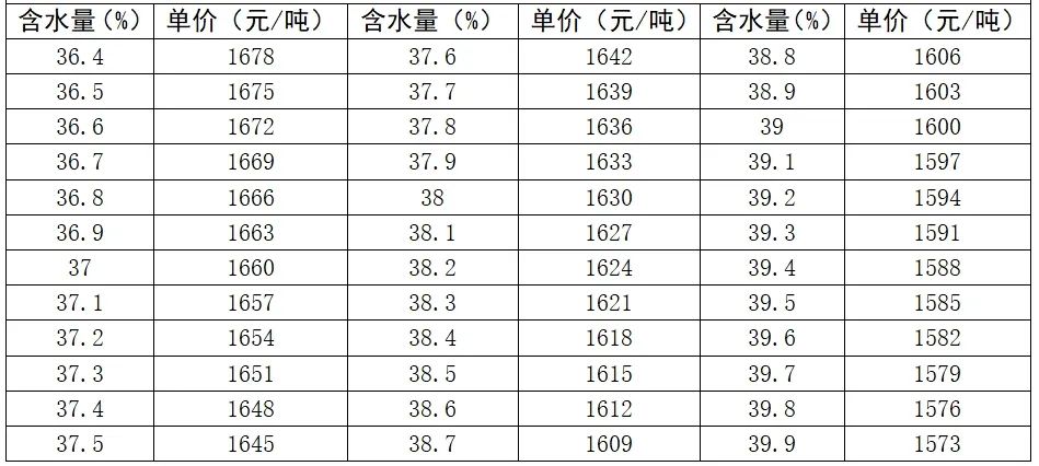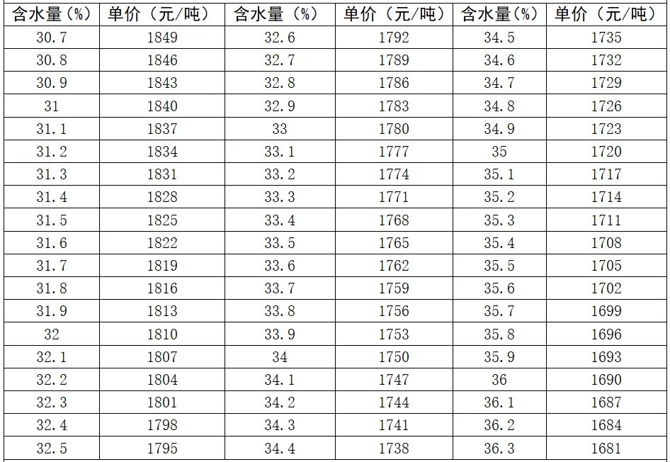 2.在实际收获销售时,采取“一车一测水、一车一核算”的方式,以竞价成交的30%含水量玉米销售单价为基准,以每车测定含水量折算实际销售单价(元/公斤),用30%含水量玉米销售单价0.935元/斤(1870元/吨)为基准,每增加/减少1%,扣/增价0.015元/斤(30元/吨)。具体测算方法详见玉米销售单价测算表。