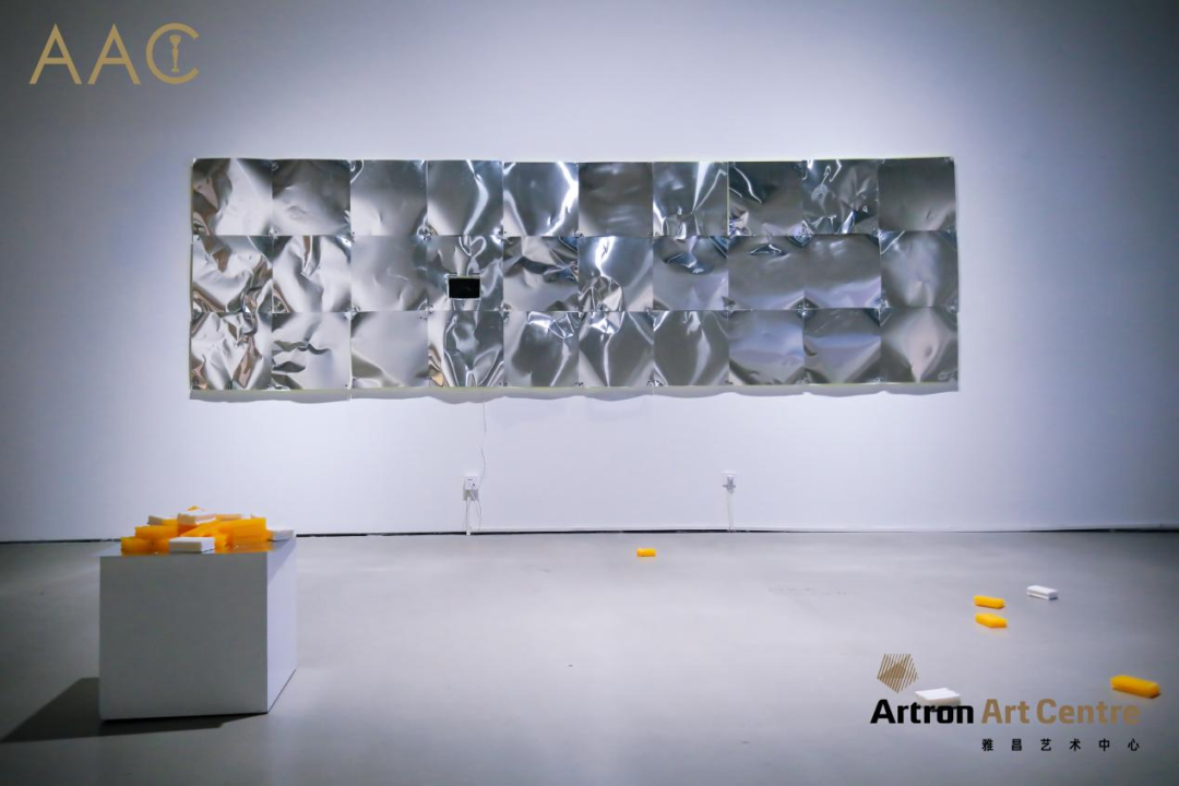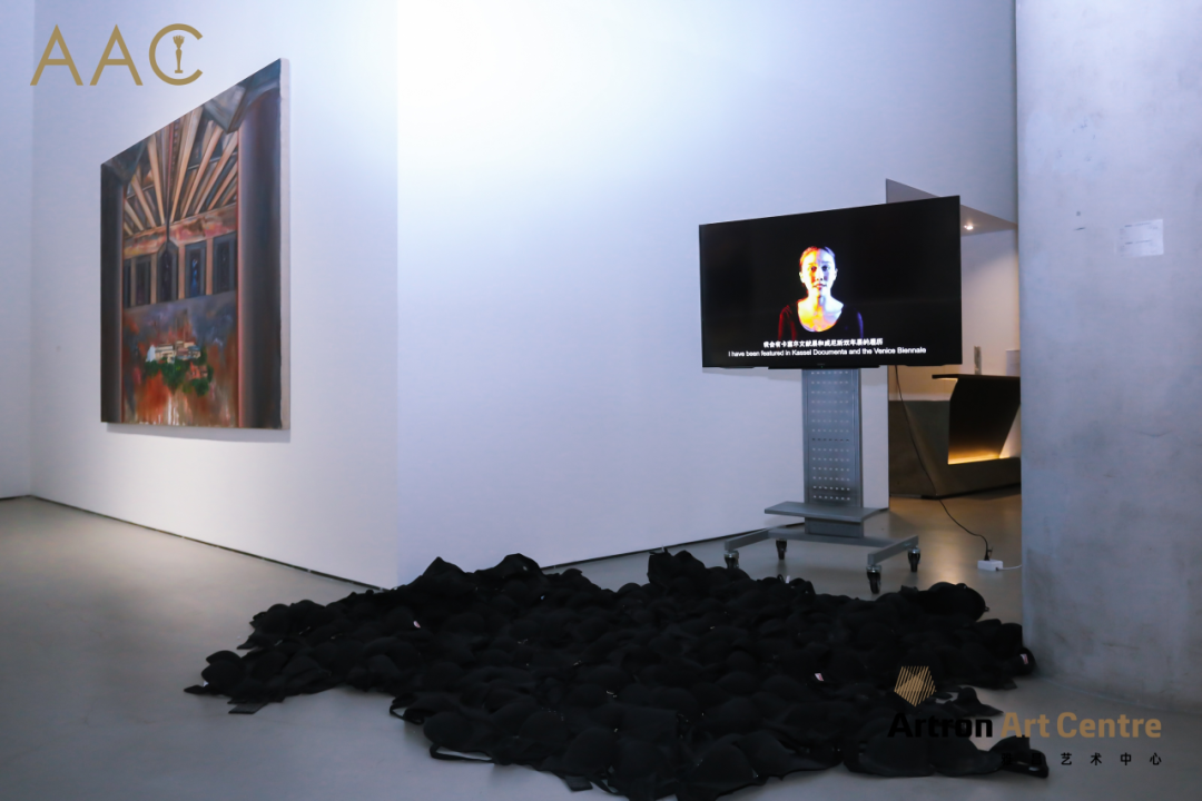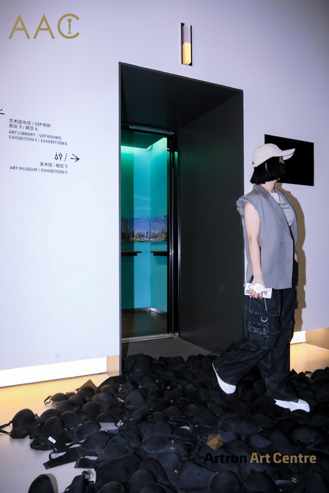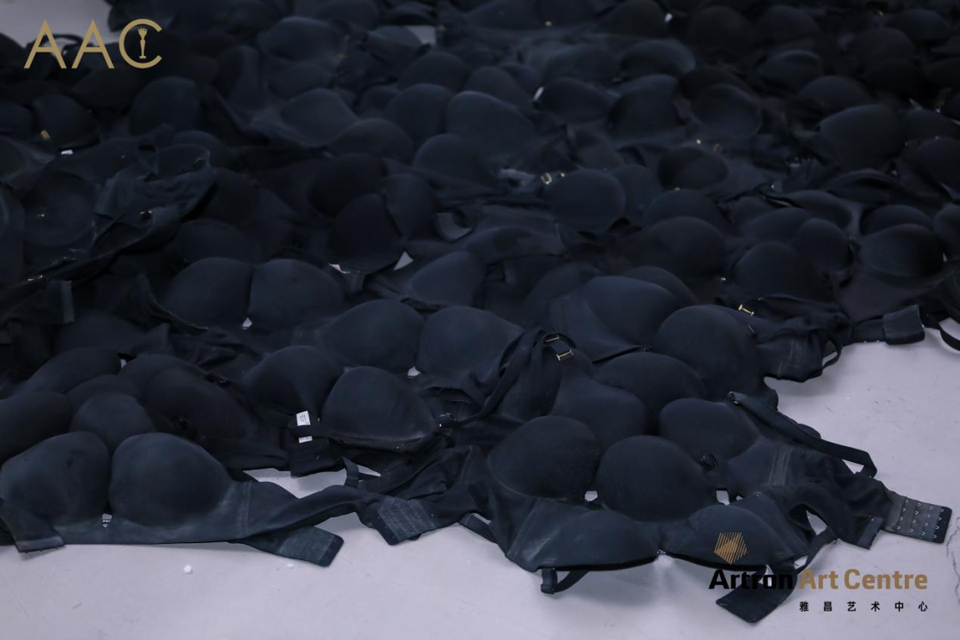 其实布展上我们也可以看到就是有很多作品跟以往那绘画作品有所不同。因为以往的作品我们需要把它挂在一个美术馆空间上,把艺术家的作品殿堂化、神圣化、崇高化的过程。但是我们可以看到现场这次展览有很多作品,可以放在地上跟观众互动,甚至有很多作品他需要观众去触摸。我们可以看到曹雨的作品《彩云》,是用女性的内衣制成的,他需要观众从这个作品上面踩踏过去。