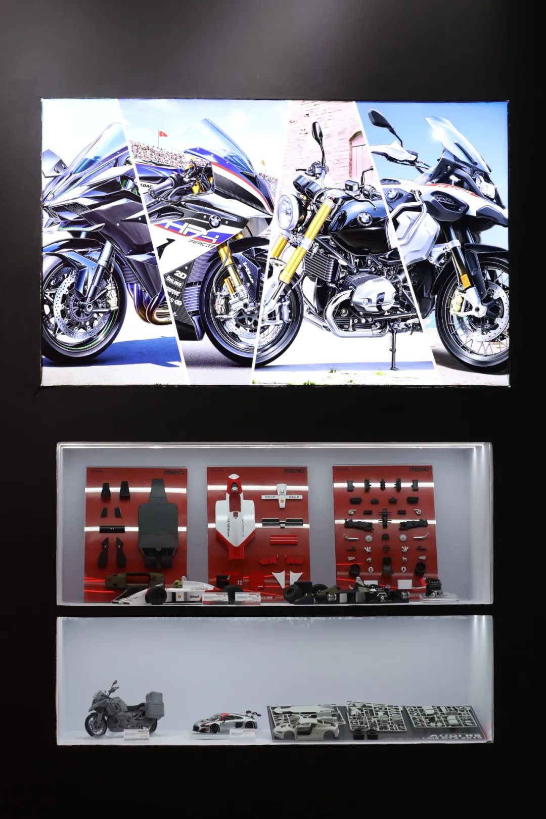 民用区则是展出了RS-005 迈凯伦 MP4/4 1988 悦色版及板件,同时CS-006 奥迪R8 LMS的完成品及板件也是首次展出,开发中的MT-005 BMW水鸟也一并亮相。