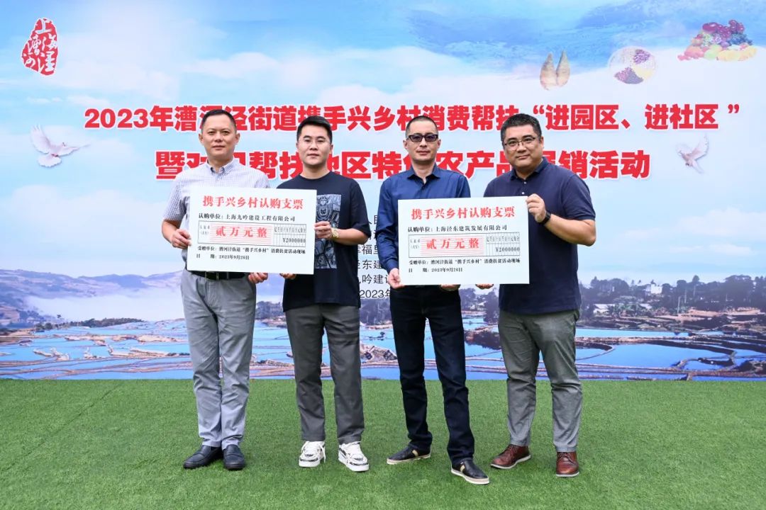活动现场,漕河泾街道爱心企业上海九吟建设工程有限公司和上海泾东建筑发展有限公司分别认购2万元农产品。这些农产品将作为员工福利进行发放,通过爱心的传递,助力贫困地区品牌农产品走向市场。漕河泾街道党工委副书记吴晨晖、办事处副主任张建分别接过两家公司的携手兴乡村认购支票,对他们的爱心和支持表达敬意,对现场积极参与奉献爱心的社区居民和企业白领表示感谢。