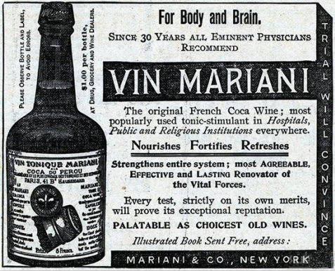 你知道吗?可口可乐是基于波尔多葡萄酒发明的。其实这种饮料叫做马里亚尼葡萄酒,它是葡萄酒和古柯叶的混合物。酒中的酒精从古柯叶中提取了可卡因,使这种饮料表面上能够使人恢复健康和活力。很多名人喜欢这种饮料:尤利西斯·辛普森·格兰特、大仲马、托马斯·爱迪生,甚至教皇都喜欢喝。
