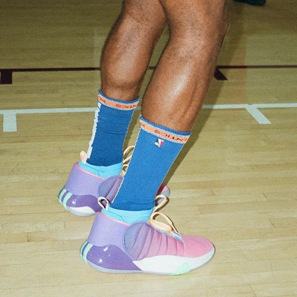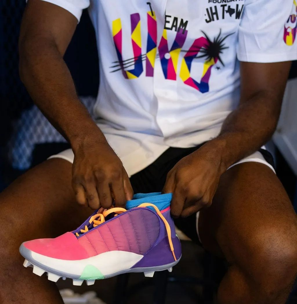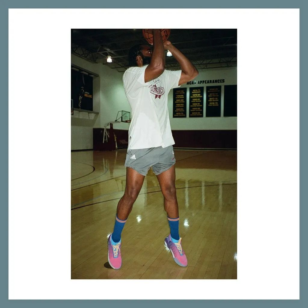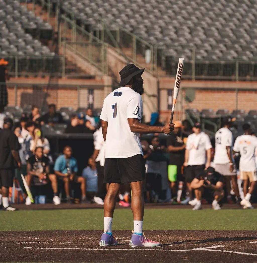 其实这款配色哈登早在 8 月份的红酒棒球邀请赛就上脚过,但当时是有钉子的棒球鞋版本,因此这次是篮球鞋版本的首次亮相。