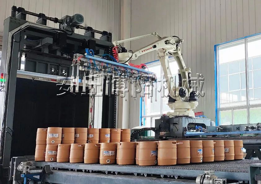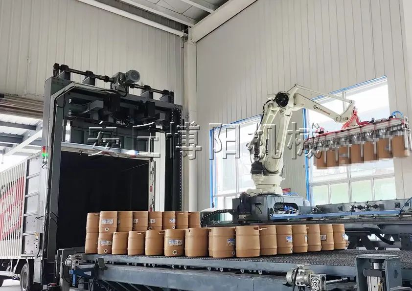 啤酒桶整体推进式自动装车机工作流程:物料通过缓冲输送线进入待抓取输送线,输送线排序进入待抓取位,机器人抓取物料至装车机推板上码垛,待推入车厢。货车进入停车位,通过传感器检测车辆整体及偏移尺寸,装车机通过高低、前后、左右角度旋转各个方向进行位置调整,将装车机和车厢对齐,推板将货物推送至车厢内,落下龙门架档板,止挡抵住货物,抽出推板,完成装车。