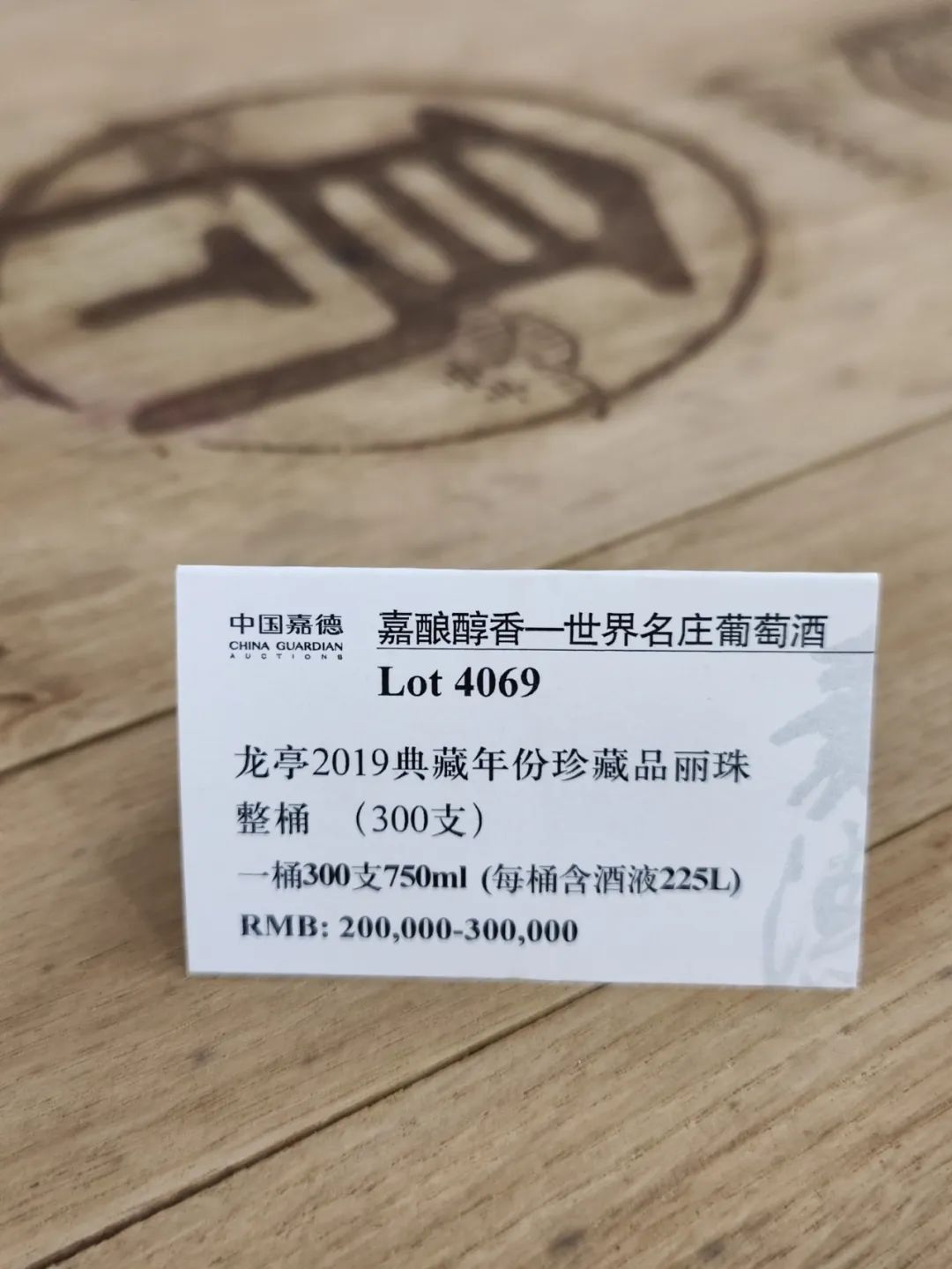 2022年12月的中国嘉德秋拍中,首次出现原产地为中国的整桶葡萄酒拍品,这就是来自龙亭酒庄的珍藏品丽珠红葡萄酒。此次的拍品以整桶定制形式出现,拍品为225L的橡木桶装葡萄酒,这些酒会在完成装瓶之后交付到买家手中,总量为300瓶(每瓶750ml)。