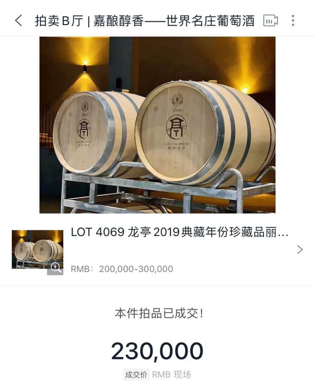 26日下午,嘉酿醇香——世界名庄葡萄酒板块唯一一个以整桶形式呈现的拍品压轴登场,龙亭酒庄珍藏品丽珠红葡萄酒2019年份(整桶限量版)最终以23万元成交。这是中国葡萄酒首次以整桶形式进入拍卖市场,并且逆势上扬,在超过半数拍品流拍的情况下被拍走。