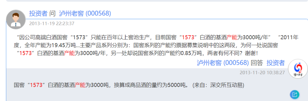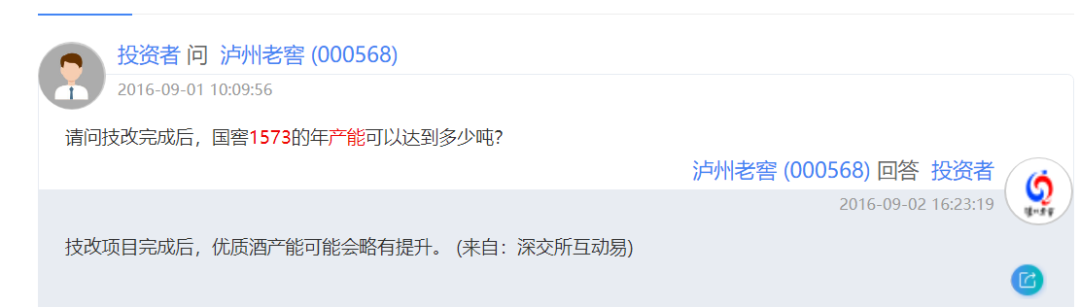 在2016年技改项目公告发布后,泸州老窖给投资者的答复显示,国窖1573目前基酒有20000多吨储备,技改项目建成投产后,以前生产中低等级基酒的老窖池可以置换出来,用于生产国窖1573。