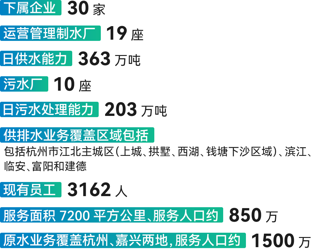 目前,市水务集团正在按照市委市政府指示要求,全力推进市域水务一体化深改任务,改革完成后,供水规模780万吨/天(2025年)、污水处理规模535万吨/天(2025年),服务范围覆盖杭州全市域13个区县市,服务面积1.68万平方公里,服务人口约1500万(不含嘉兴)。