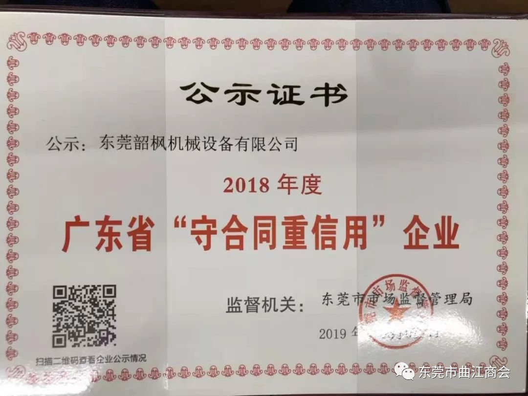 近日,广东省市场监督管理局为广东省社会信用体系建设进程发展作出突出贡献的优秀企业予以表彰公示,东莞韶枫机械设备有限公司荣获2018年度“广东省守合同重信用企业”称号。