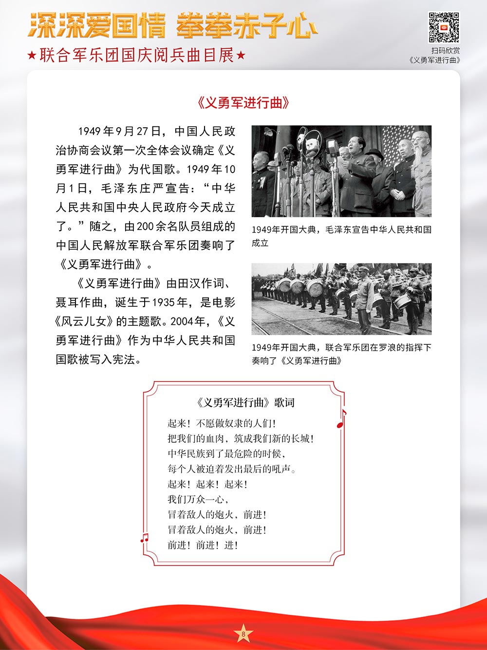 从开国大典奏响的第一首乐曲《东方红》、中华人民共和国国歌《义勇军进行曲》(当时为代国歌),到进入新世纪的《第二炮兵进行曲》(《火箭军进行曲》)、《红旗颂》,再到国庆70周年阅兵为装备方队行进全新创作的《钢铁洪流进行曲》《东方浩荡进行曲》……本展览精选历次阅兵中使用的经典乐曲和首次演奏的乐曲进行展示,让我们在激昂、热血的军乐声中感受祖国的伟大、人民军队的不朽,并向这支在国庆庆典中入场最早、站立最长、离场最晚的特殊部队致敬!