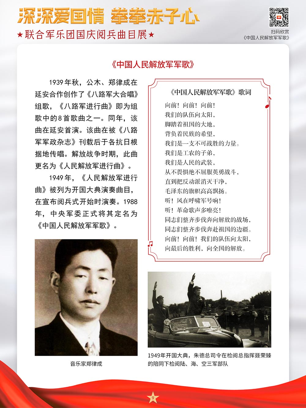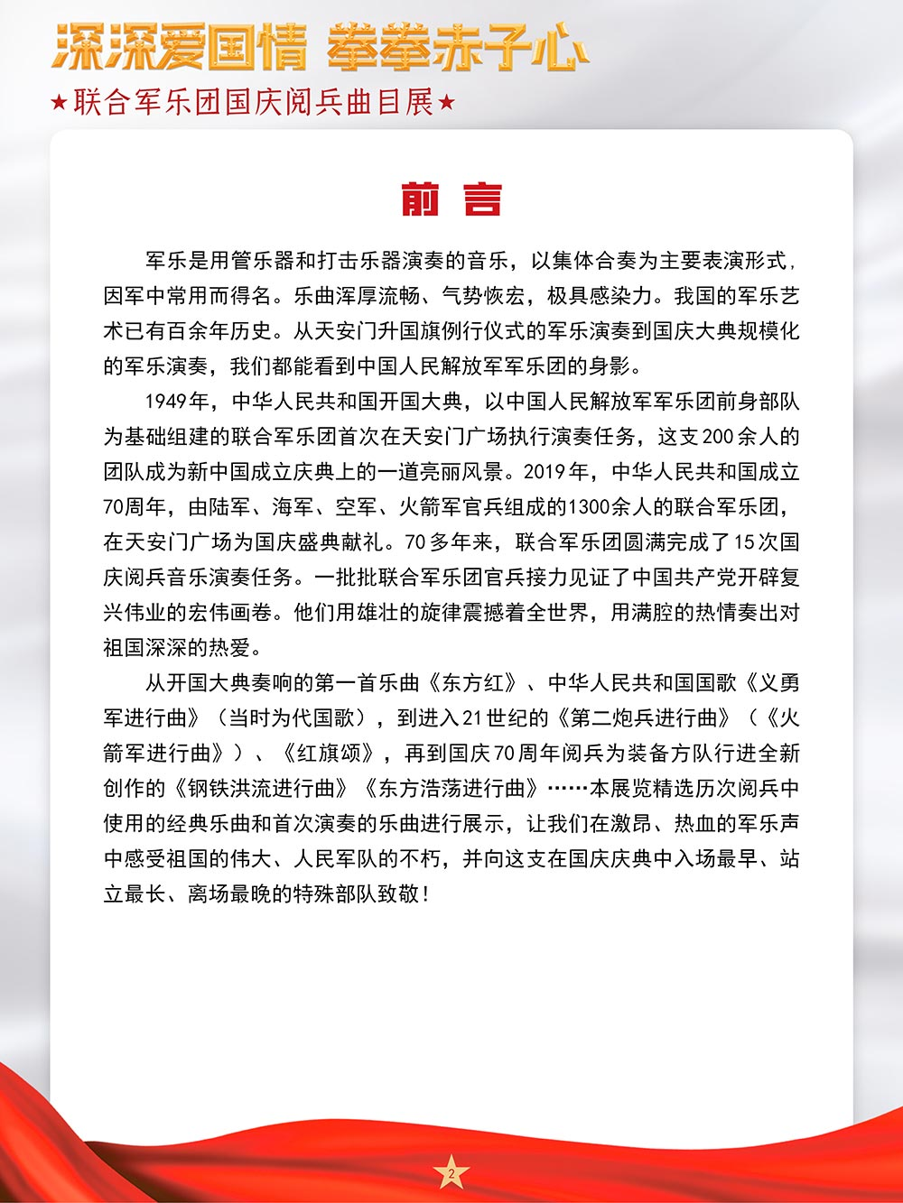 点击下方蓝色“阅读原文”观看“深深爱国情 拳拳赤子心——联合军乐团国庆阅兵曲目展”微信端全景展