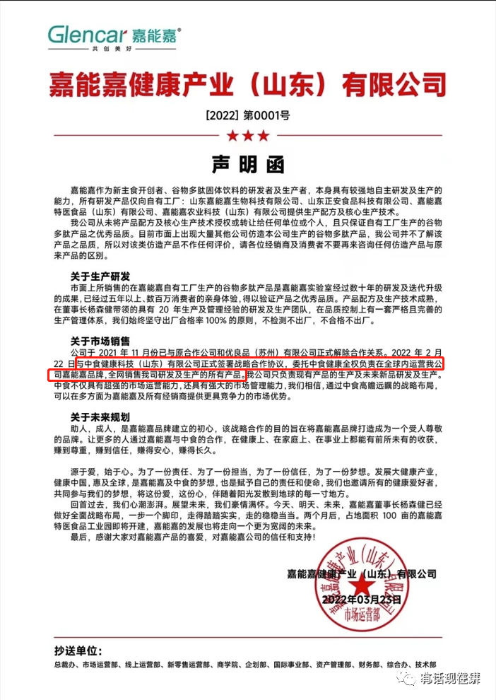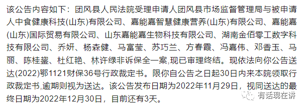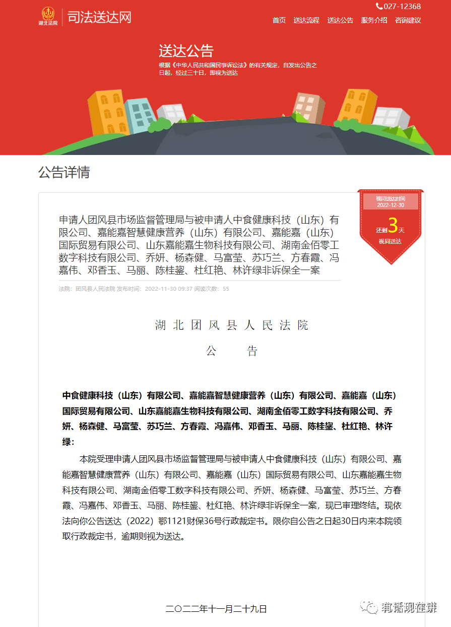 嘉能嘉:运营方中食科技及关联企业人被异地法院财产保全!日前, 湖北省团风县人民法院发布的公告显示,中食健康科技(山东)有限公司(简称:中食科技公司)、山东嘉能嘉生物科技有限公司等企业及关联人员被团风县市场监督管理局诉至该法院申请财产保全。