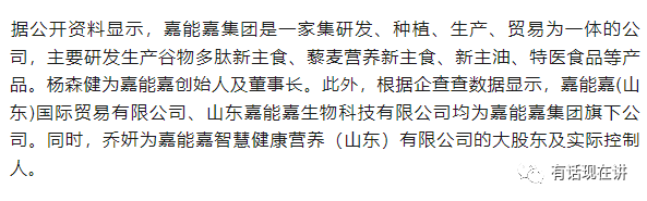 企查查显示,嘉能嘉健康产业(山东)有限公司现已更名为山东嘉能嘉健康科技集团有限公司(简称:嘉能嘉集团),该公司成立于2020年2月24日,注册资金300万元,公司法人代表及实际控制人为乔妍,持股比例为59.10%。公司另一主要人员杨森健持股40.90% 。