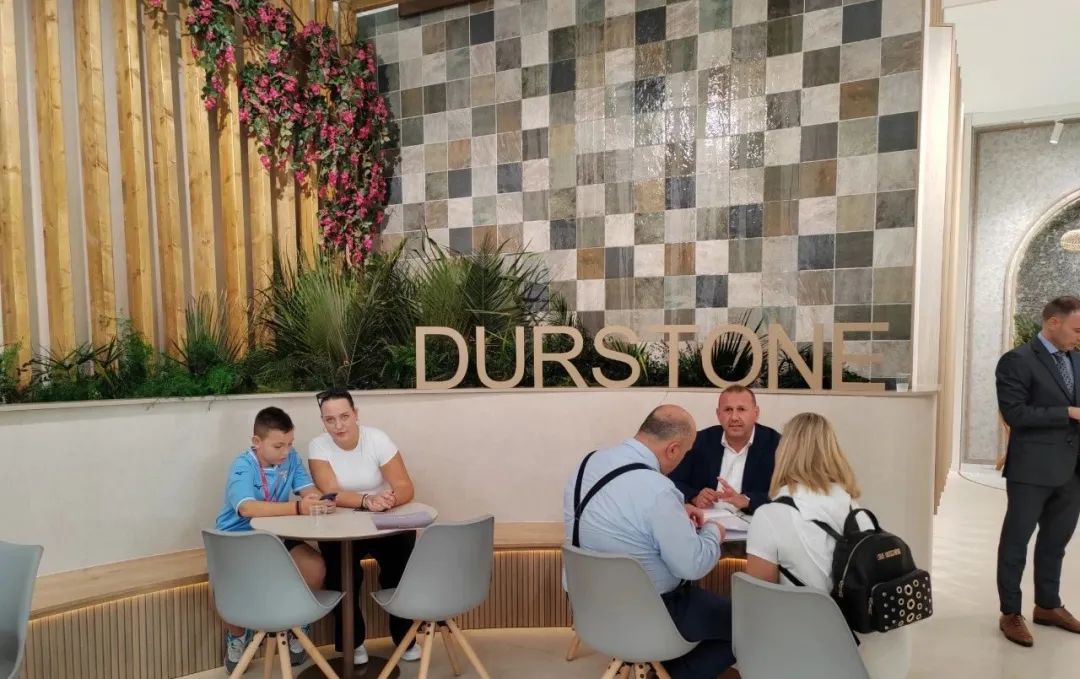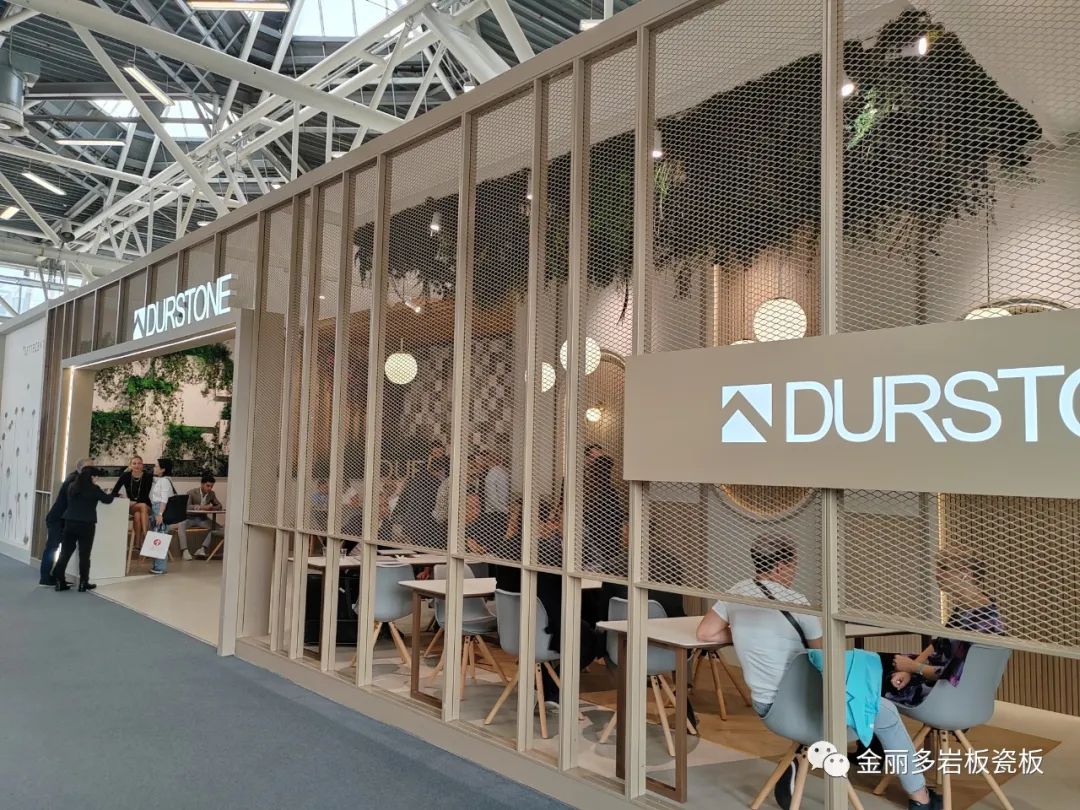 金丽多西班牙分公司DURSTONE,此次展位200多平方,以简洁的展位设计,实用的洽谈空间,样板间与产品展示相结合的方式,大气且实用。