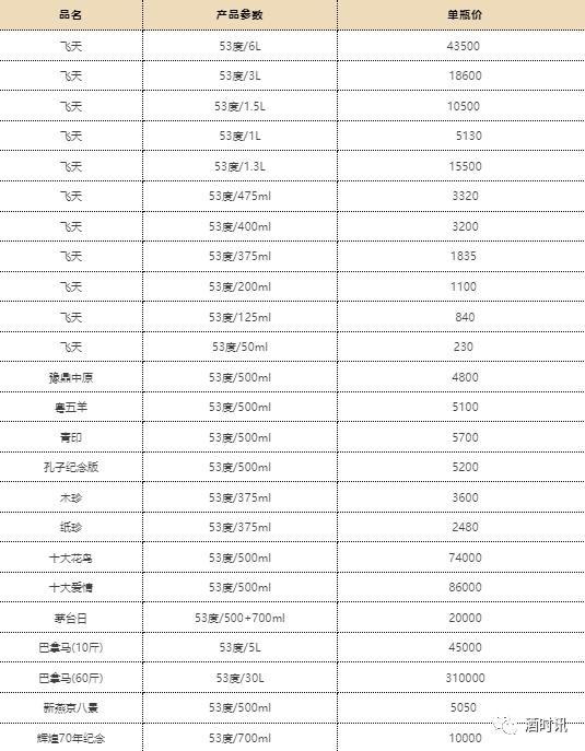 0 珍5 53%VOL 500ML 135 135 0 珍酒尊藏 53%VOL 500ML 255 255 0 老珍酒 53%VOL 500ML 80 80 0 古井贡系列 规格 10.4 10.5 涨幅 古20 52%VOL 500ML 500 500 0 古16 52%VOL 500ML 320 320 0 古8 50%VOL 500ML 220 220 0 古5 50%VOL 500ML 103 103 0 幸福版 50%VOL 500ML 76 76 0 安酒系列 规格 10.4 10.5 涨幅 经典 53%VOL 500ML 650 650 0 臻藏 46+70%VOL 500ML 410 410 0 恒昌烧坊 规格 10.4 10.5 涨幅 1经典 53%VOL 500ML 390 390 0 西凤系列 规格 10.4 10.5 涨幅 红西凤 55%VOL 500ML 725 725 0 酒海陈藏(10年) 52%VOL 500ML 150 150 0 酒海陈藏(5年) 42%VOL 500ML 78 78 0 华山论剑10 52%VOL 500ML 130 130 0 华山论剑20 52%VOL 500ML 255 255 0 华山论剑30 55%VOL 500ML 380 380 0 华山论剑50 52%VOL 500ML 480 480 0 老绿玻瓶 55%VOL 500ML 40 40 0 怀庄 规格 10.4 10.5 涨幅 怀庄聖品 53%VOL 500ML 150 150 0 怀庄大曲 53%VOL 500ML 160 160 0 丹泉系列 规格 10.4 10.5 涨幅 丹泉10 50%VOL 500ML 150 150 0 丹泉15 53%VOL 500ML 400 400 0 丹泉20 53%VOL 500ML 510 510 0 丹泉30 53%VOL 500ML 835 835 0 双沟系列 规格 10.4 10.5 涨幅 圣坊 46%VOL 500ML 150 150 0 君坊 52%VOL 500ML 85 85 0 双沟大曲 53%VOL 500ML 12 12 0 口子窖系列 规格 10.4 10.5 涨幅 30年型 52%VOL 500ML 720 720 0 20年型 41%VOL 500ML 320 320 0 10年型 41%VOL 500ML 215 215 0 6年型 41%VOL 500ML 100 100 0 潭酒系列 规格 10.4 10.5 涨幅 紫潭 53%VOL 500ML 390 390 0 红得发紫 53%VOL 500ML 275 275 0 红潭 53%VOL 500ML 190 190 0 金酱 53%VOL 500ML 125 125 0 银酱 53%VOL 500ML 90 90 0 杜康系列 规格 10.4 10.5 涨幅 小封坛(青坛) 46%VOL 500ML 310 310 0 小封坛(玉坛) 52%VOL 500ML 620 620 0 12窖区(新) 52%VOL 500ML 175 175 0 9窖区(新) 50%VOL 500ML 105 105 0 6窖区(新) 50%VOL 500ML 70 70 0 白云边系列 规格 10.4 10.5 涨幅 20年陈酿 53%VOL 500ML 410 410 0 15年陈酿 42%VOL 500ML 140 140 0 12年陈酿 42%VOL 500ML 100 100 0 5星 53%VOL 500ML 80 80 0 4星 53%VOL 500ML 50 50 0 3星 53%VOL 500ML 36 36 0 个性茅台系列参考价格