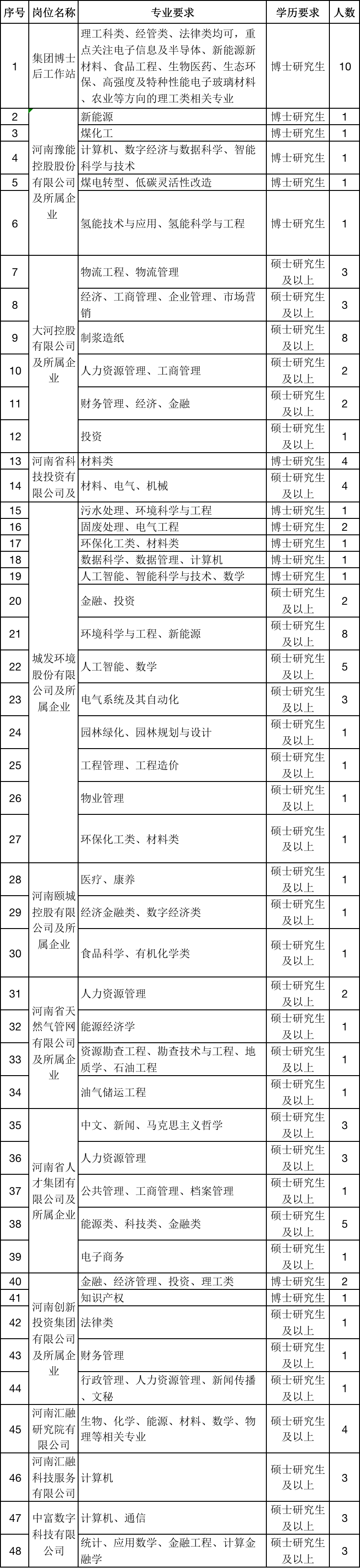 河南投资集团有限公司是河南省政府批准设立的国有独资公司,是省政府的重要投融资平台。集团始终坚守“政治使命、企业属性”的理念,秉承“融资汇智、服务河南”的宗旨,按照国有资本运营公司定位,以“股权投资运营”为主业,以全省“十大战略”为导向,以“基金+直投”为工具,以金融服务和资本运营为支撑,形成金融与实业双轮驱动、基础产业与新兴产业相互促进、强周期产业与弱周期产业优势互补的发展格局,着力做好全省优势产业的发展壮大者、传统产业的提质升级者、新兴产业的引领培育者、未来产业的破冰布局者。“十三五”以来,集团累计实现利润230亿元、上缴税金200亿元,经营业绩稳居全省前列;资产规模从1140亿元增长到3140亿元,净资产从366亿元增长到1116亿元,5年时间再造了一个“投资集团”;2022年,克服疫情反复和大宗商品价格高企影响,全年实现营业收入474亿元,利润总额36亿元,新增投资167亿元,带动投资500亿元。目前,作为第一大股东管理资产2.2万亿元,参控股上市公司69家,拥有国内AAA、国际A-高评级信用资质,成为河南经营效益好、发展速度快、综合实力强的省属企业之一。为满足战略发展需要,诚邀优秀高校英才加盟河南投资集团,携手开创未来高质量发展的新篇章。(一)积极拥护党的路线、方针、政策,遵守法律法规。(二)能够积极践行集团企业文化和核心价值观,具有较强的事业心、责任感和团队精神。(三)专业基础知识扎实,学习能力强,具有胜任岗位工作需要的能力和素质。(四)具有良好的心理素质和能够正常履行岗位职责的身体条件。1.2020年以来获得博士学位或2024年应届毕业。3.所学或从事的专业与河南投资集团发展方向具有较高的相关性,或对拟从事研究的项目有足够的学科背景支持和研究积累。4.具有较强的研究功底、敬业精神与沟通能力,能够独立、高质量地完成研究任务并承担相关工作。5.原则上应具备全脱产在工作站从事博士后研究工作的条件。2.毕业院校为双一流A类高校、全球排名前200高校、相关专业在全国排名靠前高校。备注:海外高校排名参考最新软科及QS世界大学综合排名;海外应届生的毕业时间范围在2023年7月至2024年6月。110名博士研究生和重点高校硕士研究生。由集团总部组织招聘,具体岗位在博士后工作站、各专业平台公司和重点企业,作为集团总部和重点布局发展产业的关键培养储备人才。具体计划如下: