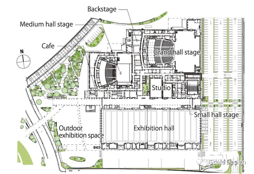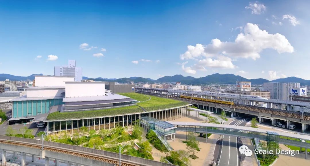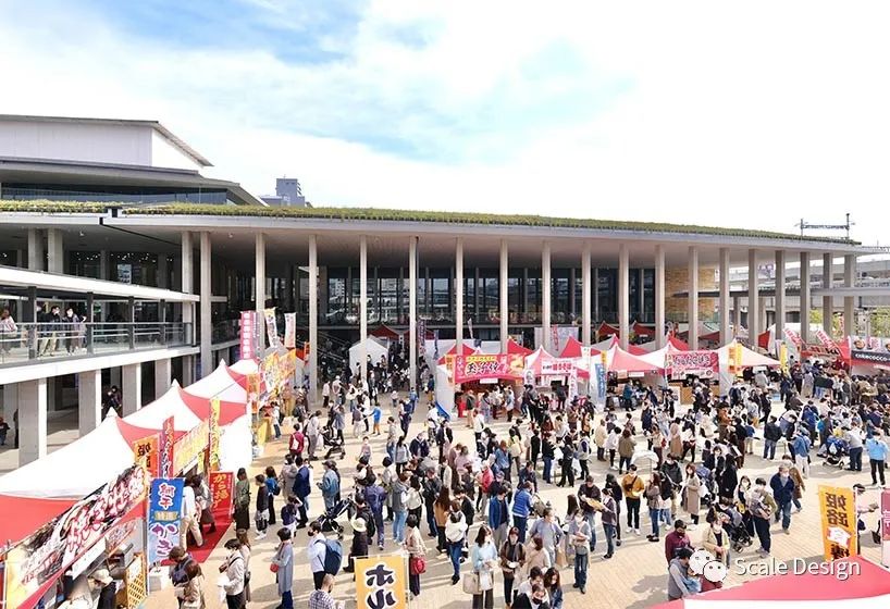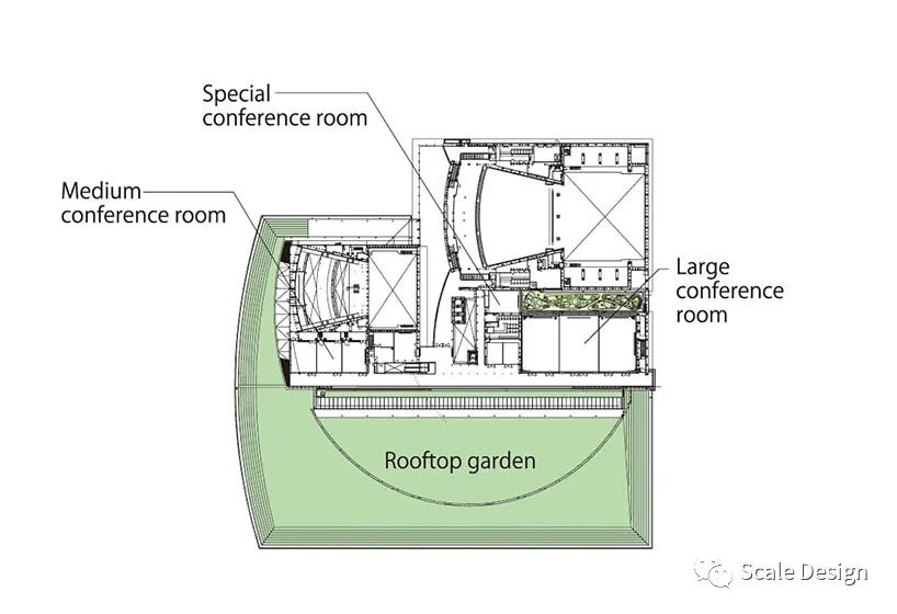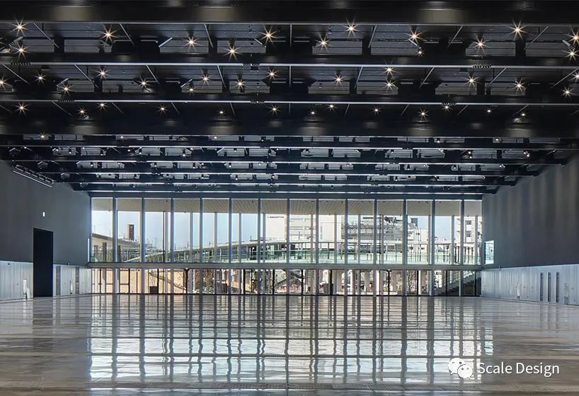 可移动的隔断将4,000平方米的展厅及其10米高的天花板分为三个独立的区域。透明的玻璃门使大厅与公园西侧的宽敞户外展览空间一起使用。四楼的会议室俯瞰南侧屋顶绿化和北侧庭院,营造出无处不在的绿色氛围。南侧会议室地板与人眼齐平,新干线(子弹头列车)乘客在屋顶上可见,与过往列车形成一种联系感。