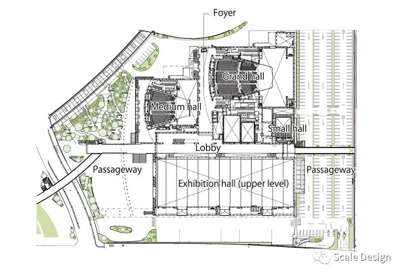沿着公园的有盖人行道从车站延伸到中心,提供防雨保护。与姬路相关的花草树木排列在人行道上,长椅和水景让游客在前往中心二楼大厅的路上欣赏季节性风景。大厅由东向西延伸,可直接通往小、中、大礼堂,以及通往相邻县立医院的通道。天窗在大堂的大砖墙上投下微妙的阴影。大堂透过窗户俯瞰展厅和工作室,可以瞥见下面正在进行的当地活动。