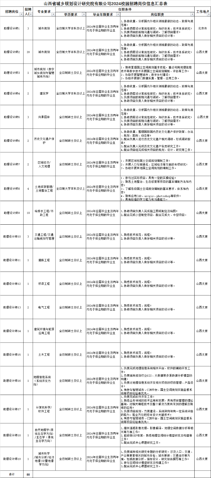 山西省城乡规划设计研究院有限公司成立于1981年,(以下简称“山西省规划院”)原隶属于山西省住房和城乡建设厅,2021年6月完成整体划转后,现为山西大地环境投资控股有限公司全资子公司,经过40年的发展,已经成长为专业齐全、技术雄厚、人才荟萃、资质类别全、资质等级高,在国内具有综合影响力的规划设计研究机构之一。山西省规划院现有员工489人。现拥有城乡规划编制、建筑工程、给水工程、排水工程、道路工程、桥梁工程、风景园林工程设计以及工程咨询八项甲级资质。经营范围涵盖国土空间规划编制、研究和实施评估工作及相关规划咨询;国土空间大数据研究(大数据与国土空间信息技术研究);生态景观与风景园林设计、市政工程设计、环境工程设计、建筑工程设计、文化与旅游规划设计、交通规划与设计及相关专业的技术咨询和研究工作、工程咨询等多专业多行业。40年来,山西省规划院始终坚持科研性质和职责定位,累计完成各类规划编制和工程设计任务万余项,获省部级以上奖项240余项;完成了一大批对社会经济发展有重大影响的重要项目,为山西省的城镇化建设、城乡经济社会发展做出了突出贡献。2024年应届毕业生及两年(2023年、2022年)择业期内未落实工作单位的高校毕业生,须按学制如期毕业且取得毕业证以及最高学历对应的学历学位证书。本次招聘助理设计师88人,具体岗位、专业要求见附件《山西省城乡规划设计研究院有限公司2024校园招聘岗位信息汇总表》。报名基本条件如下: