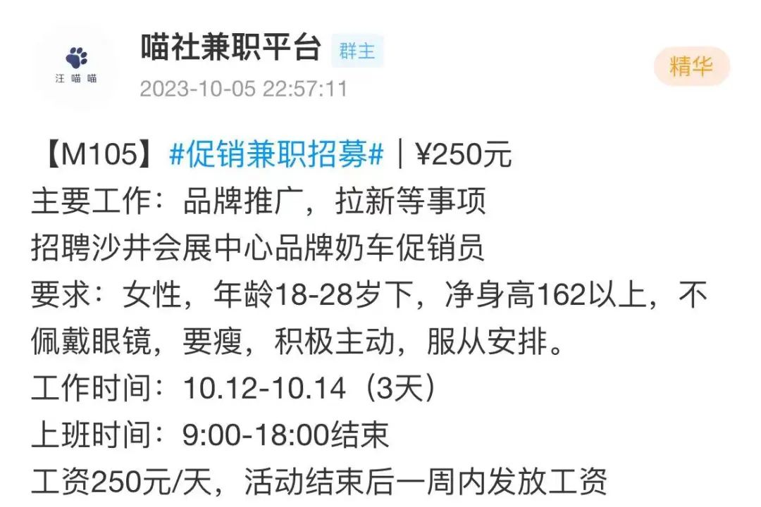另:若在兼职活动合作的过程中,遇到任何押金索取/服装费用/恶意克扣工资/恶意拖欠工资等任何活动方违规行为,均可在深圳喵社-曝光举报栏发布处理(不可涉及个人隐私)!