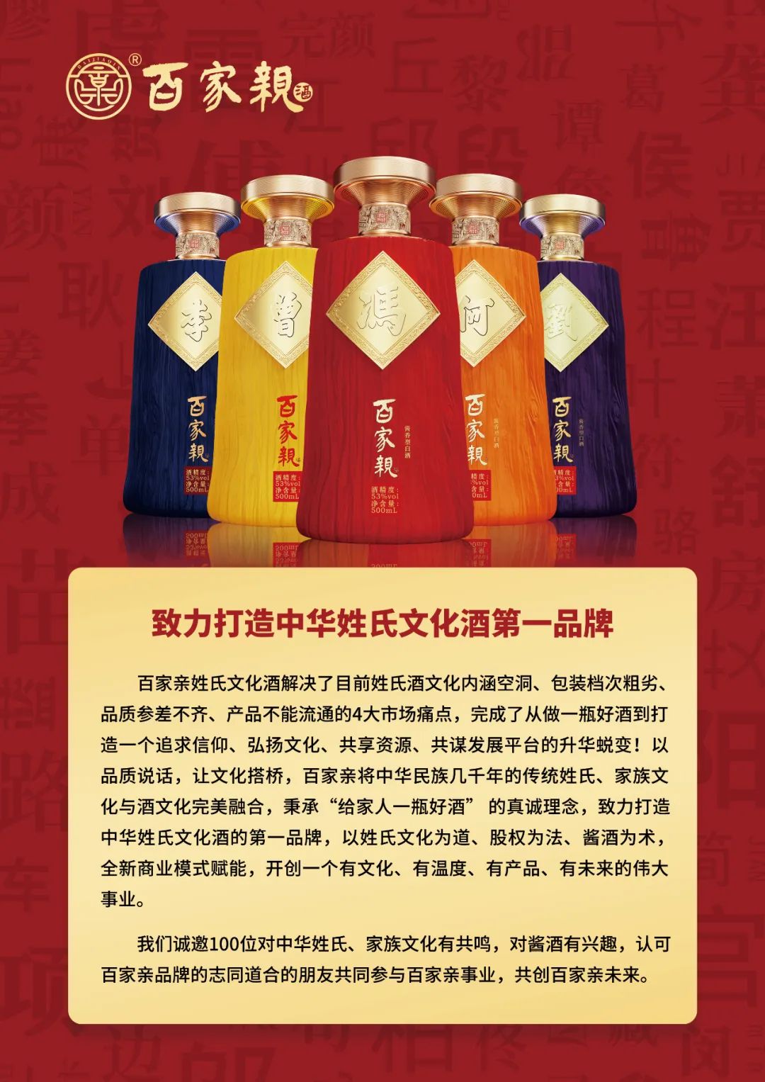 值得注意的是,本次展会,百家亲将携超强阵容,姓氏文化酒系列产品,为远道而来的朋友们提供一次品鉴高品质酱酒、共襄财机的机会。