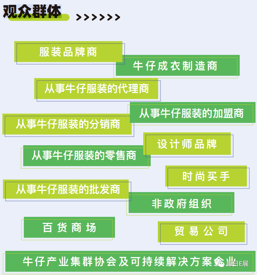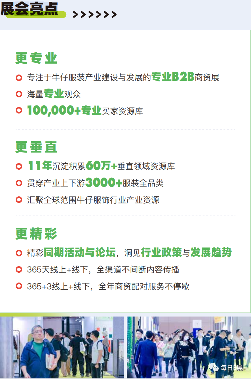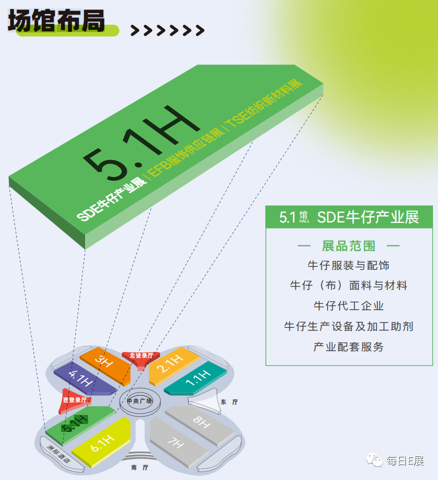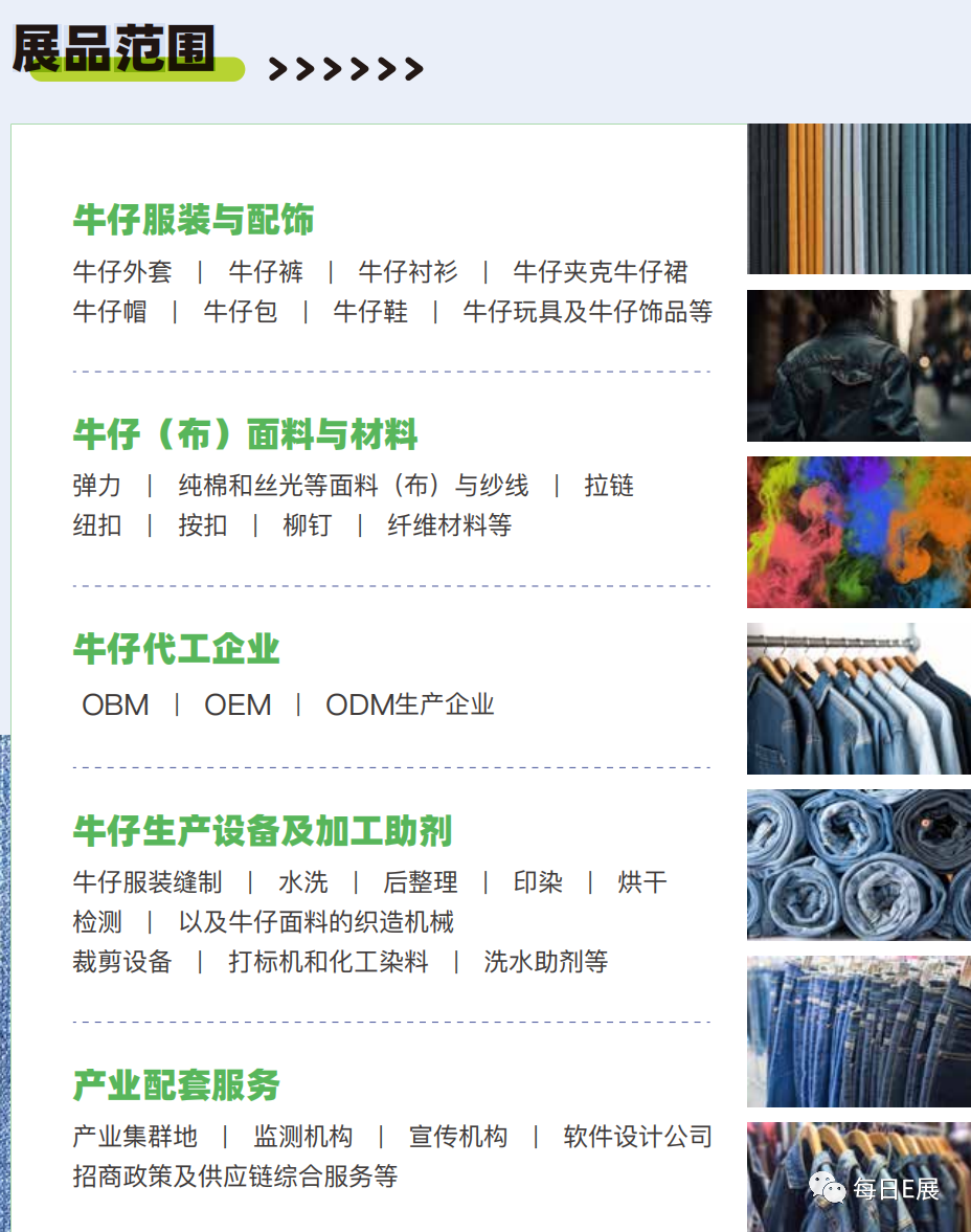 SDE牛仔产业展旨在为广大牛仔行业从业者提供一个交流、合作与学习的平台。为期三天的展会里,展会将为观众们呈现独属于牛仔文化的生活方式,让大家更深入了解最新的行业动态和未来发展趋势。届时参展企业将展示牛仔服装与配饰、牛仔(布)面料与材料、牛仔代工企业、牛仔生产设备及加工助剂、产业配套服务等各种产品,呈现包括牛仔外套、牛仔裤、牛仔衬衫、牛仔夹克、牛仔裙、牛仔帽、牛仔包、牛仔鞋、牛仔玩具及牛仔饰品等;弹力、纯棉和丝光等面料(布)与纱线、拉链、纽扣、按扣、柳钉、纤维材料等;OBM、OEM、ODM生产企业;牛仔服装缝制、水洗、后整理、印染、烘干、检测、以及牛仔面料的织造机械、裁剪设备、打标机和化工染料、洗水助剂等产业;产业集群地、监测机构、宣传机构、软件设计公司、招商政策、设计开发、电商直播、竞品选款、贴牌生产、运营策划、营销渠道平台及供应链综合服务等在内的行业潮流趋势。