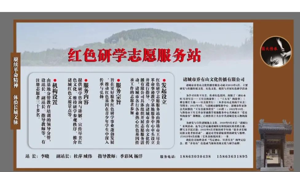 ●发起设立:红色研学志愿服务站由潍坊市王尽美革命事迹教学基地服务中心牵头设立并进行指导,由诸城市乔有山文化传播有限公司具体组织开展志愿服务活动,诸城市各行各业热心红色基因传承工作的志愿者参加。