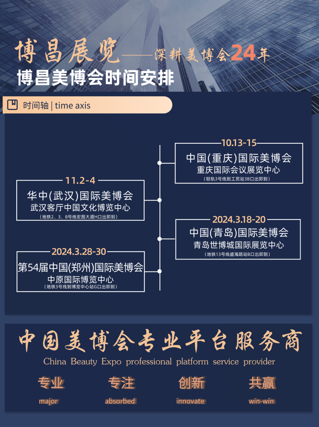 2023华中(武汉)国际美容化妆品博览会分为专业线展区、医学美容展区、中医养生美容展区、日化及进口品展区,四大领域相结合,展区分明,新品发布、高峰论坛、等大型活动同步演绎,为华中地区美容行业搭建一个集交流、形象展示、寻求代理加盟技术合作的高品质贸易平台。