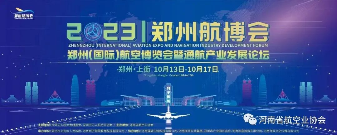 为发挥区域性优势,打造国际性专业航空博览会,推动郑州航空事业发展和通用航空产业落地,由世界无人机大会组委会、深圳市无人机行业协会支持,河南省航空业协会主办,郑州市上街区人民政府、河南列子御风教育科技有限公司承办,河南藻硅生物科技有限公司、河南亚坤实业集团、郑州市产业园区商会、河南泓嘉投资有限公司、河南海丝文化传媒有限公司协办的“2023郑州(国际)航空博览会暨通航产业发展论坛”(简称“航博会”)将于2023年10月13日-17日在郑州(上街机场)举行。